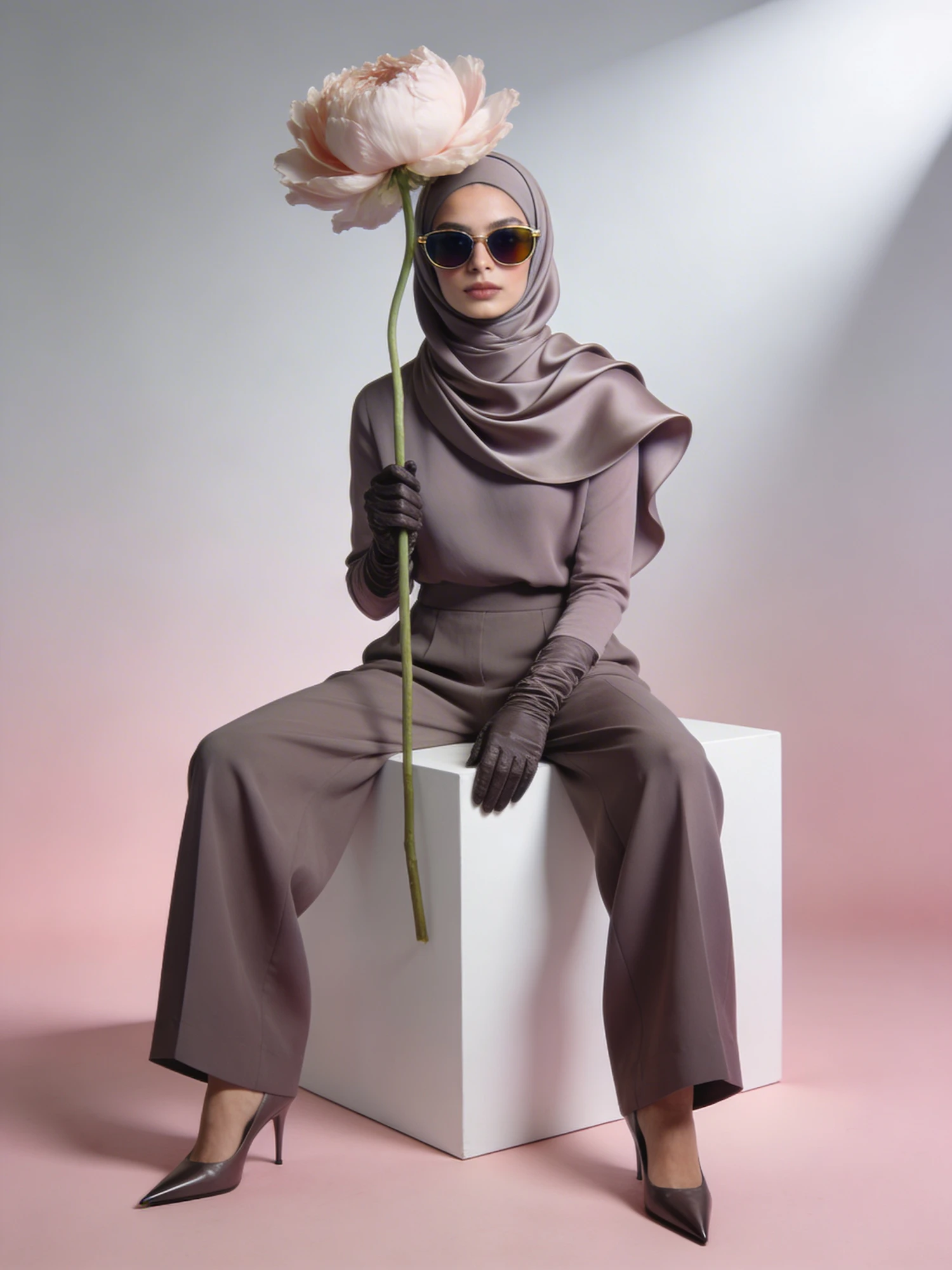 A high‑definition, minimalist editorial portrait. A stylish person sits on a white cube holding an oversized single‑stem flower with a bloom nearly the size of their head. They wear a muted monochrome outfit: soft long‑sleeved top, wide‑leg trousers, and a sculptural hijab with gentle draping. Accessories include tinted sunglasses, fitted gloves, and pointed heels. The background blends from soft pink to pale grey with crisp studio lighting. No logos, no watermarks, no extra text.
