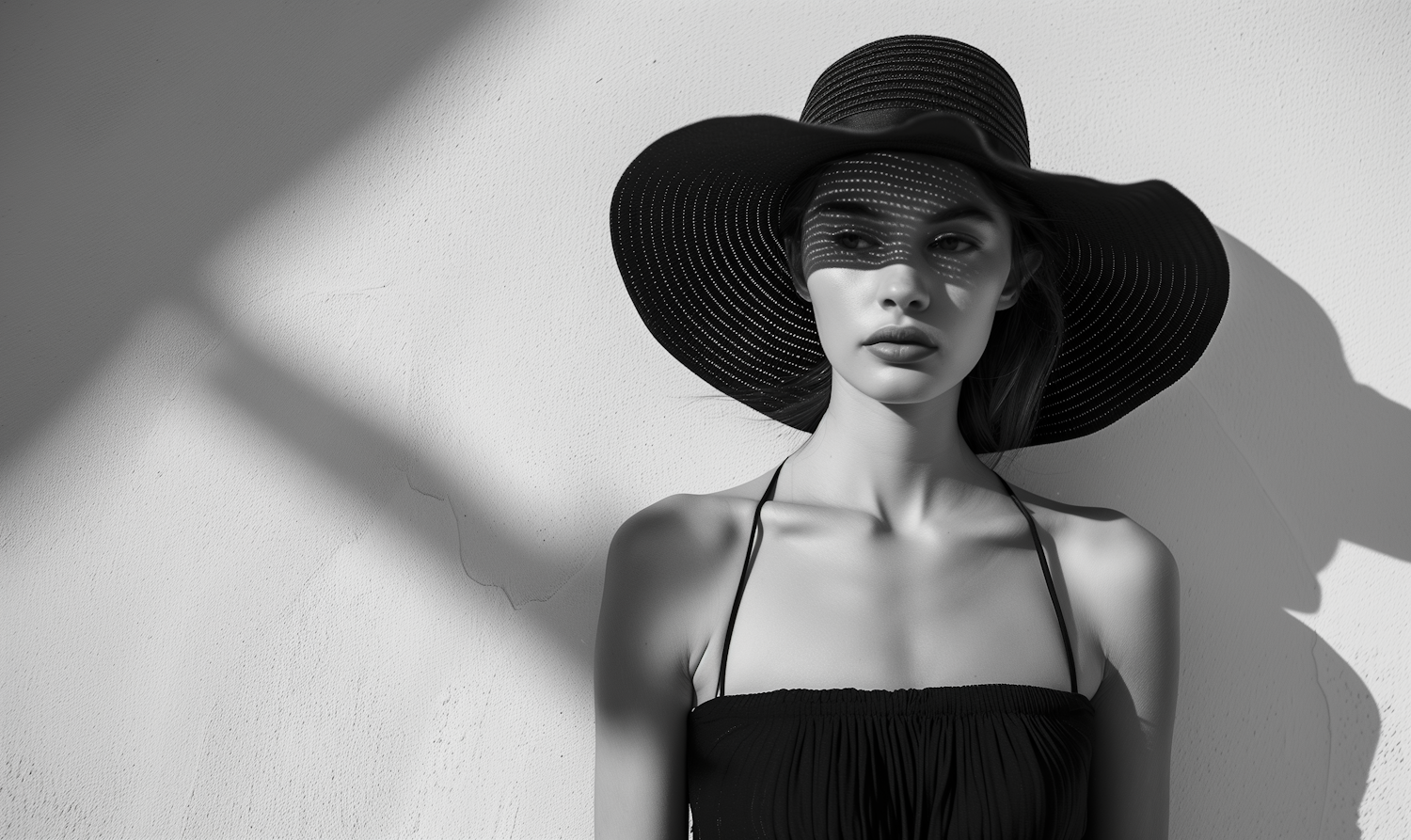 Black and white portrait of a woman in a wide-brimmed hat casting shadows on her face, against a plain white wall.