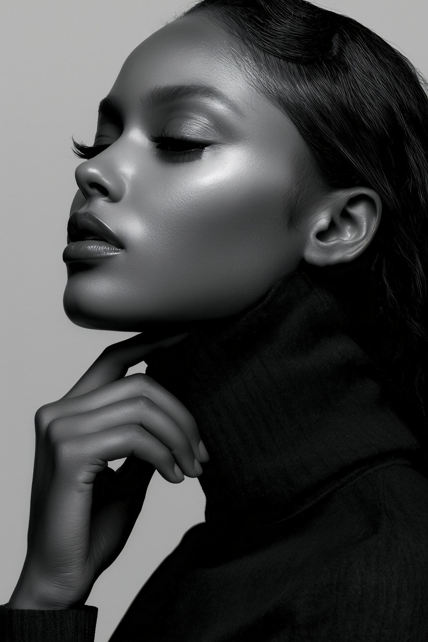 Monochromatic portrait of a serene individual with sleek hair and glowing skin, emphasizing elegance and simplicity.