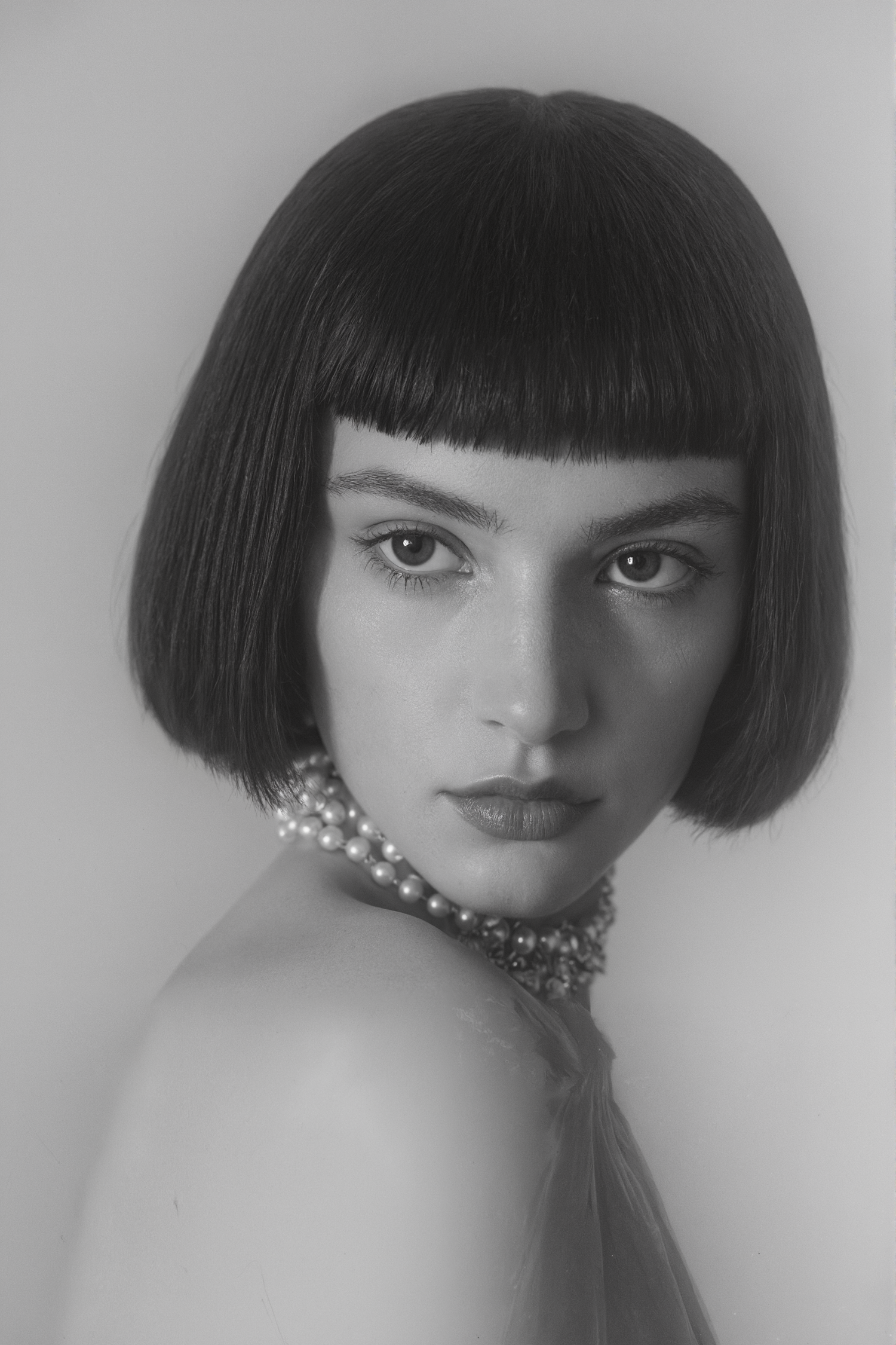 Elegant black and white portrait of a woman with a sleek bob haircut and pearl necklace, exuding timeless sophistication.