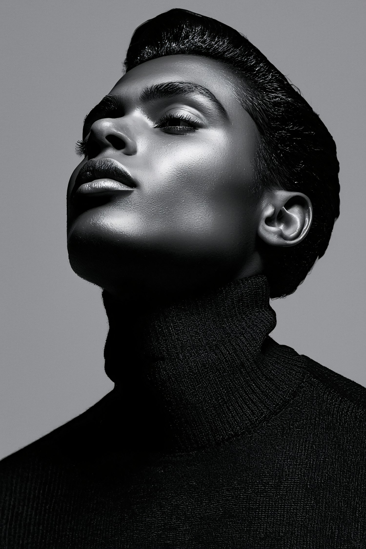 Monochromatic portrait of a person in a black turtleneck, showcasing dramatic lighting and sleek styling against a neutral background.