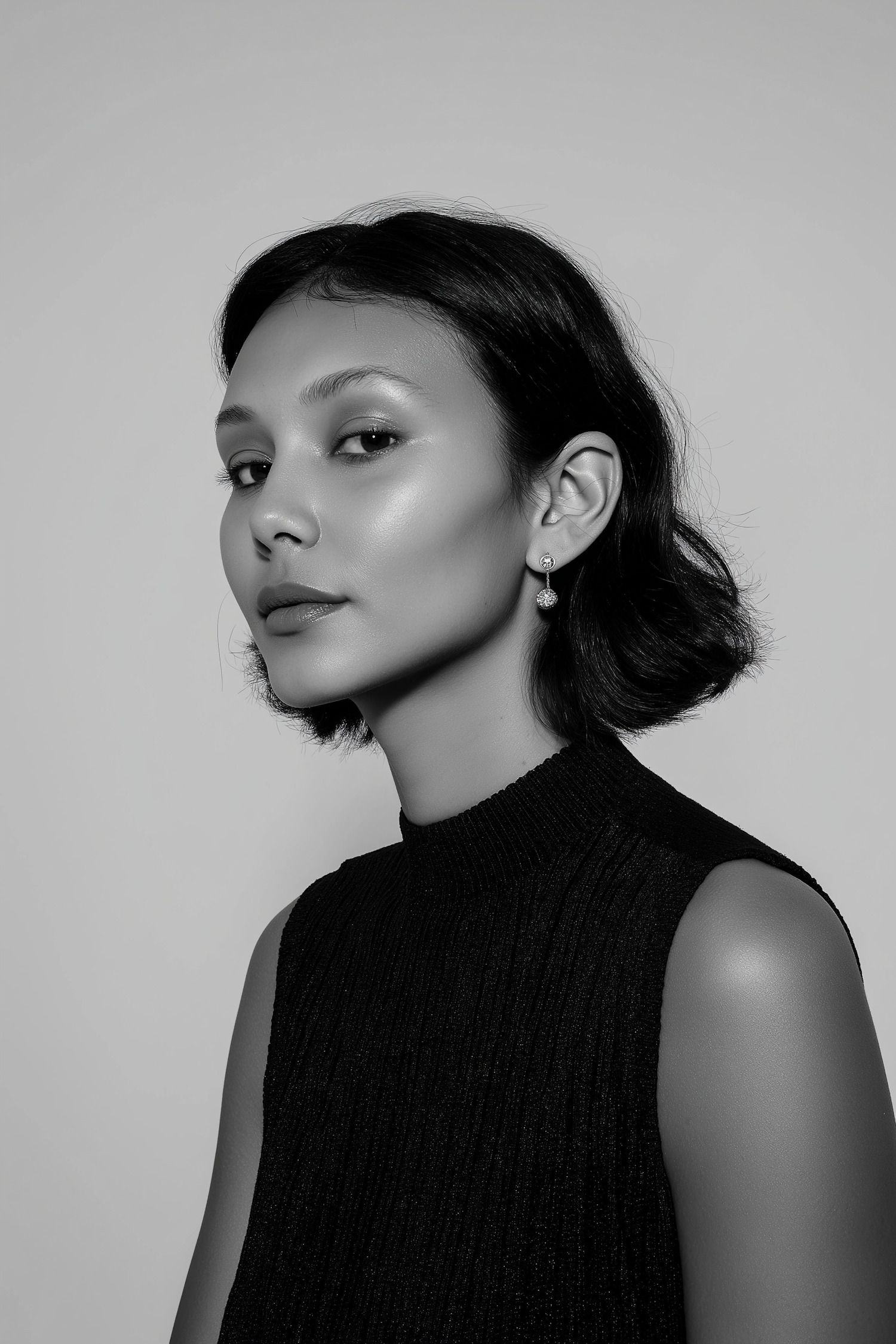 Monochrome portrait of a woman in a textured black top, showcasing elegant earrings and a confident expression.