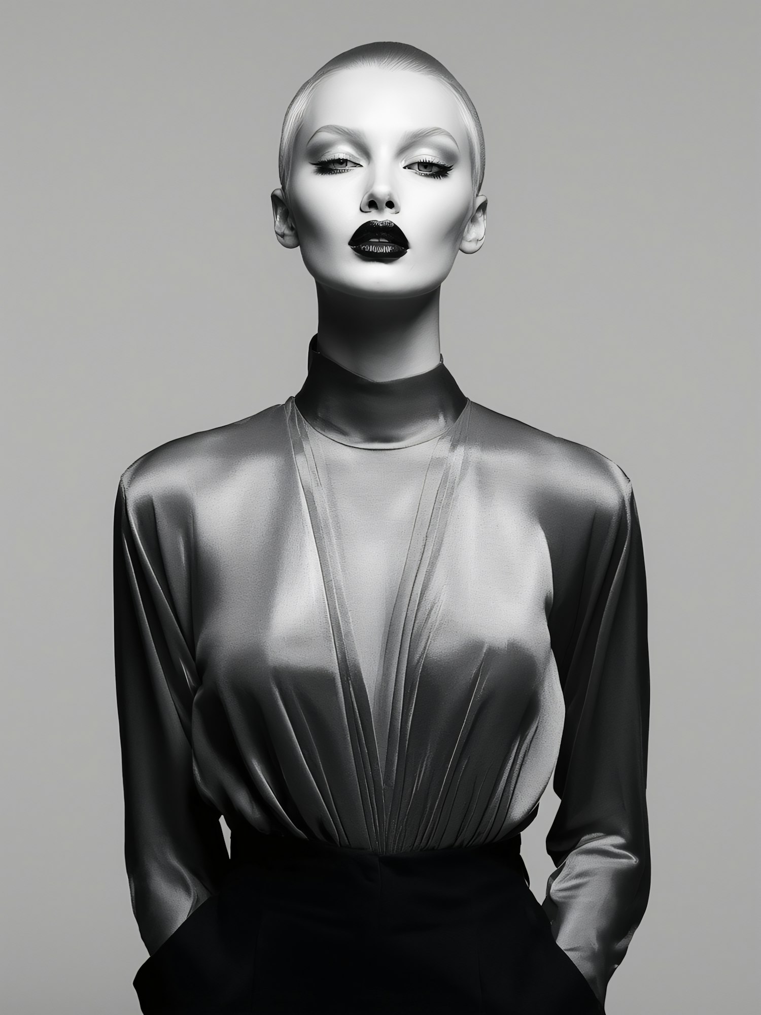Monochromatic portrait of a person with bold makeup and a sleek metallic blouse, exuding elegance and sophistication.