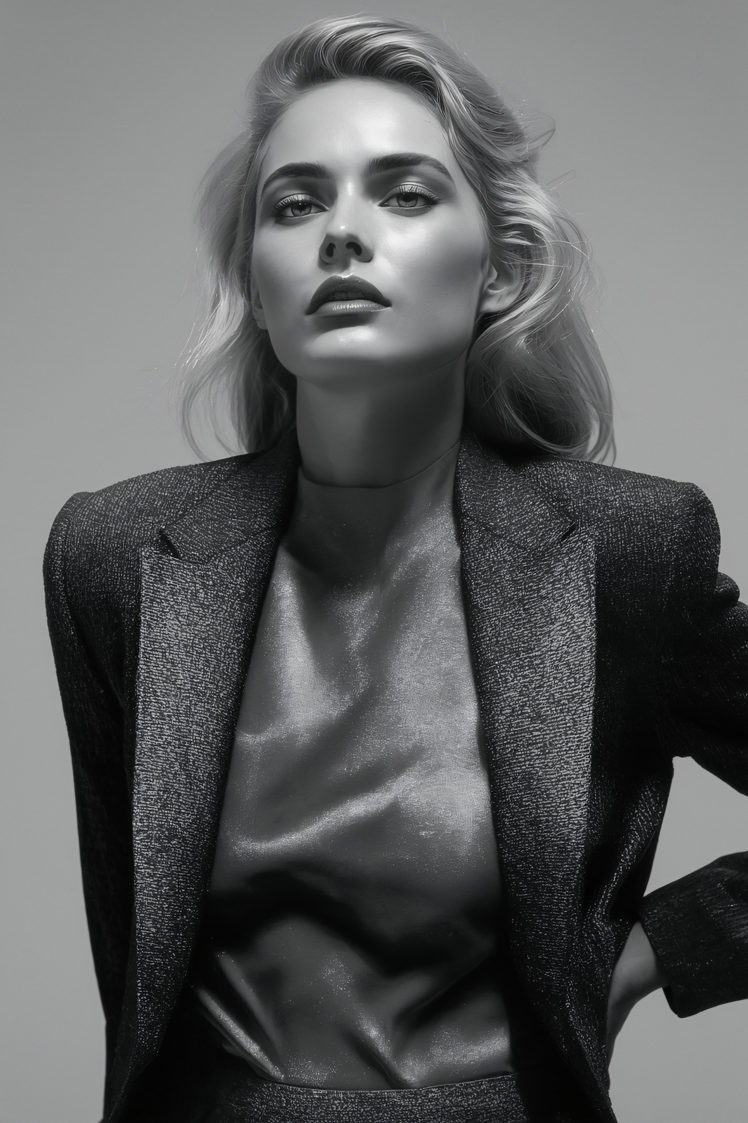 Monochrome portrait of a woman in a textured blazer and shiny top, with blonde hair and a confident expression.