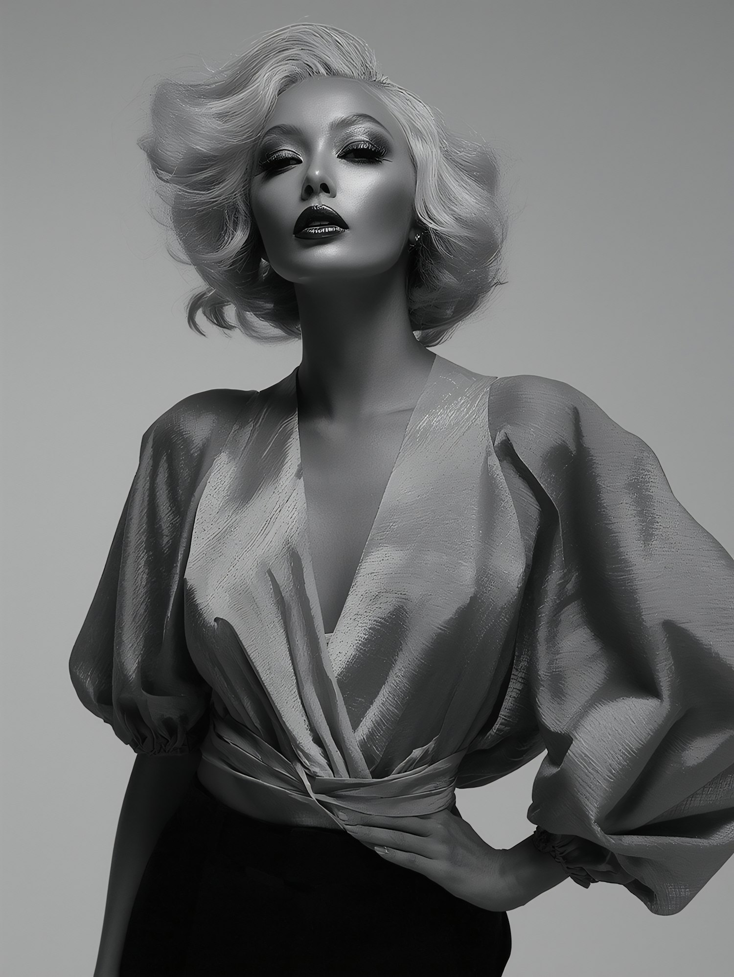 Monochromatic portrait of a stylish individual in a textured blouse with voluminous sleeves, exuding elegance and confidence.