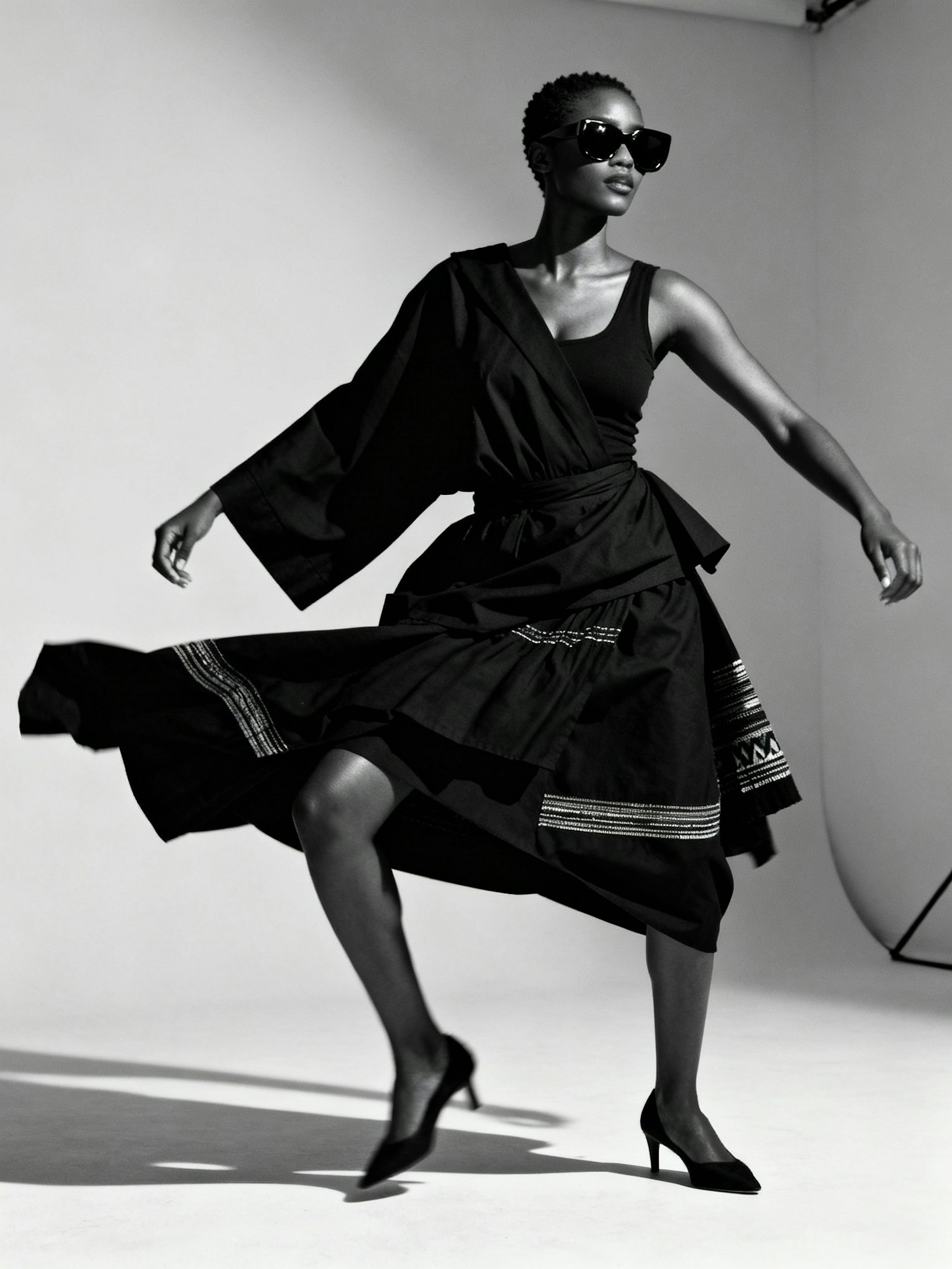 Full-body, ultra-high-definition black-and-white portrait of a stylish woman mid-motion, captured in a dynamic pose that channels Afro-fusion energy and confidence. They wear a layered black outfit inspired by contemporary African silhouettes—structured yet fluid—with bold sunglasses and subtle textile accents referencing traditional patterns. Their silhouette is sharply defined against a minimalist, light-toned studio backdrop. Directional lighting casts sculptural highlights across their skin and garment, emphasizing movement, texture, and form. The composition is stripped of distraction, blending streetwear realism with diasporic elegance. The overall mood is modern, modest, and culturally resonant—ideal for a Gen Z fashion portrait or Afro-futurist editorial showcase rooted in motion, clarity, and heritage.