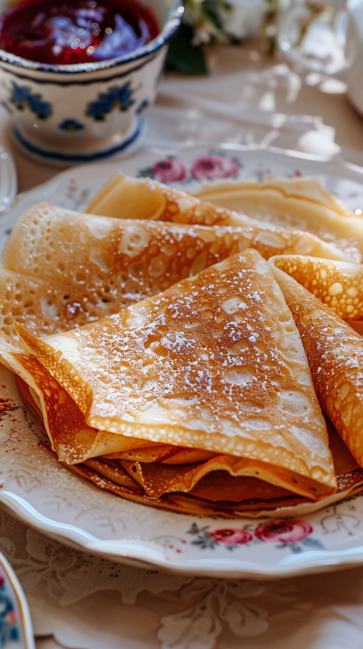 Golden crepes dusted with powdered sugar on a floral plate, accompanied by a cup of red berry sauce.