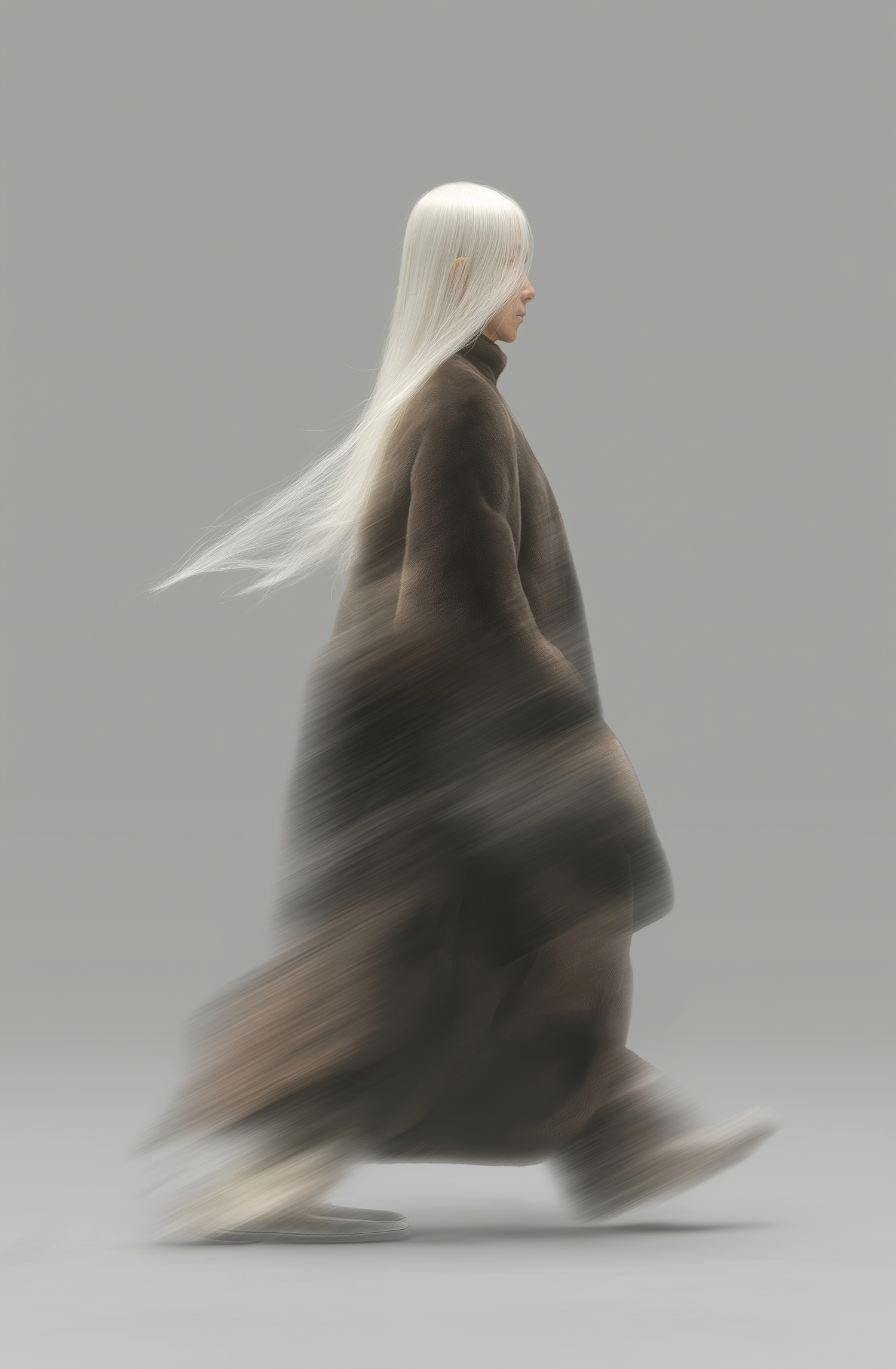 A person with long white hair in a flowing brown coat walks gracefully, with motion blur adding a dynamic touch against a gray background.