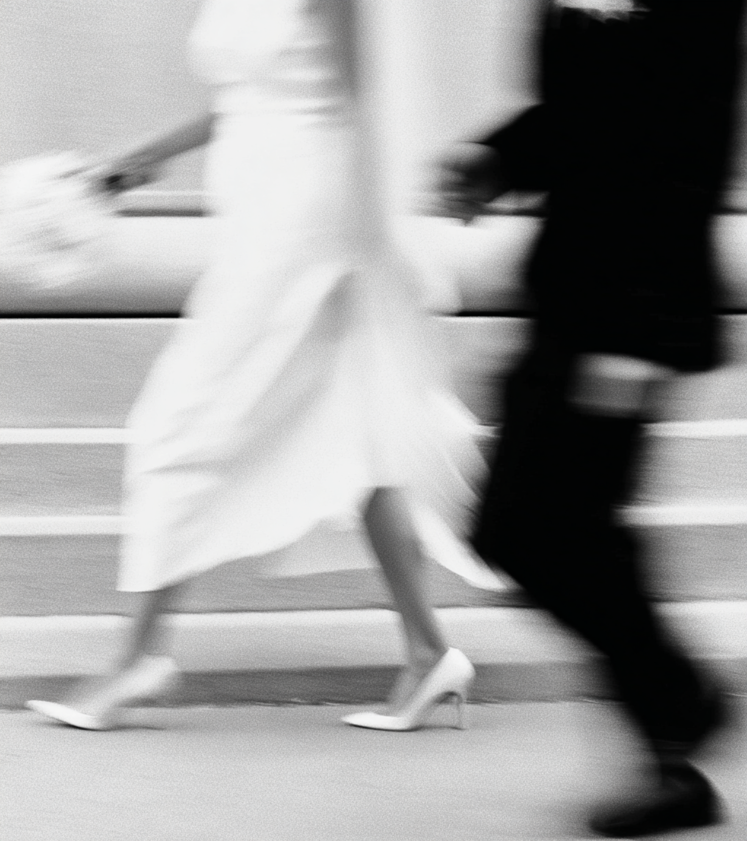 A blurred black-and-white image of two individuals walking, one in a white dress and the other in a dark suit, creating a dynamic and elegant scene.