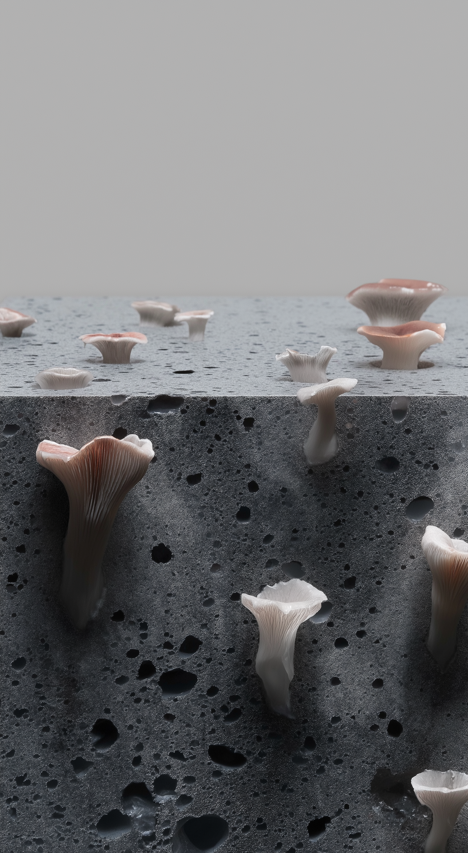 Elegant mushrooms sprout from a textured, perforated stone, creating a stunning juxtaposition of delicate and rugged elements.