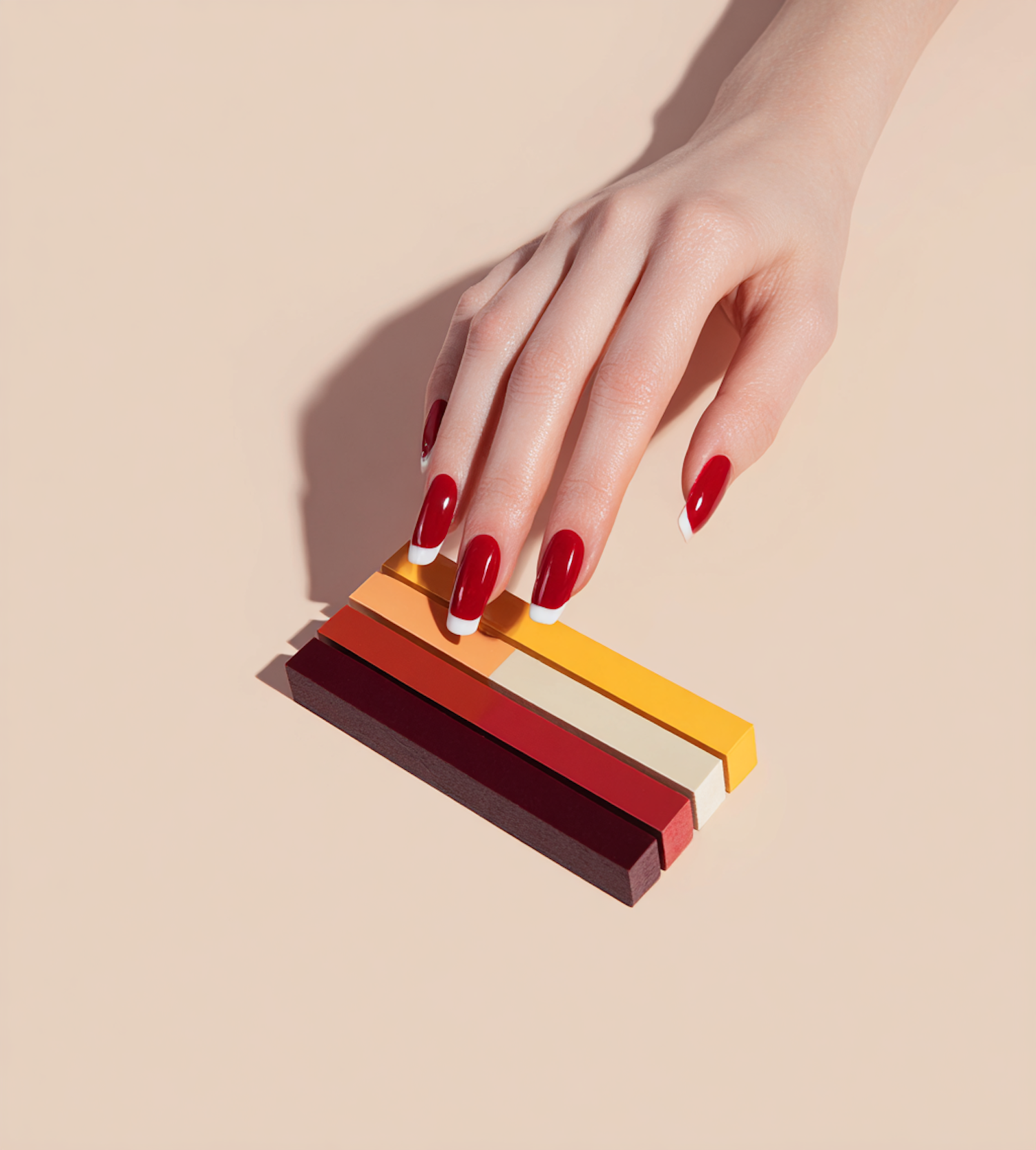 Stylish red and white manicure displayed on a hand over neatly arranged colorful blocks, illustrating a modern, minimalist beauty concept.