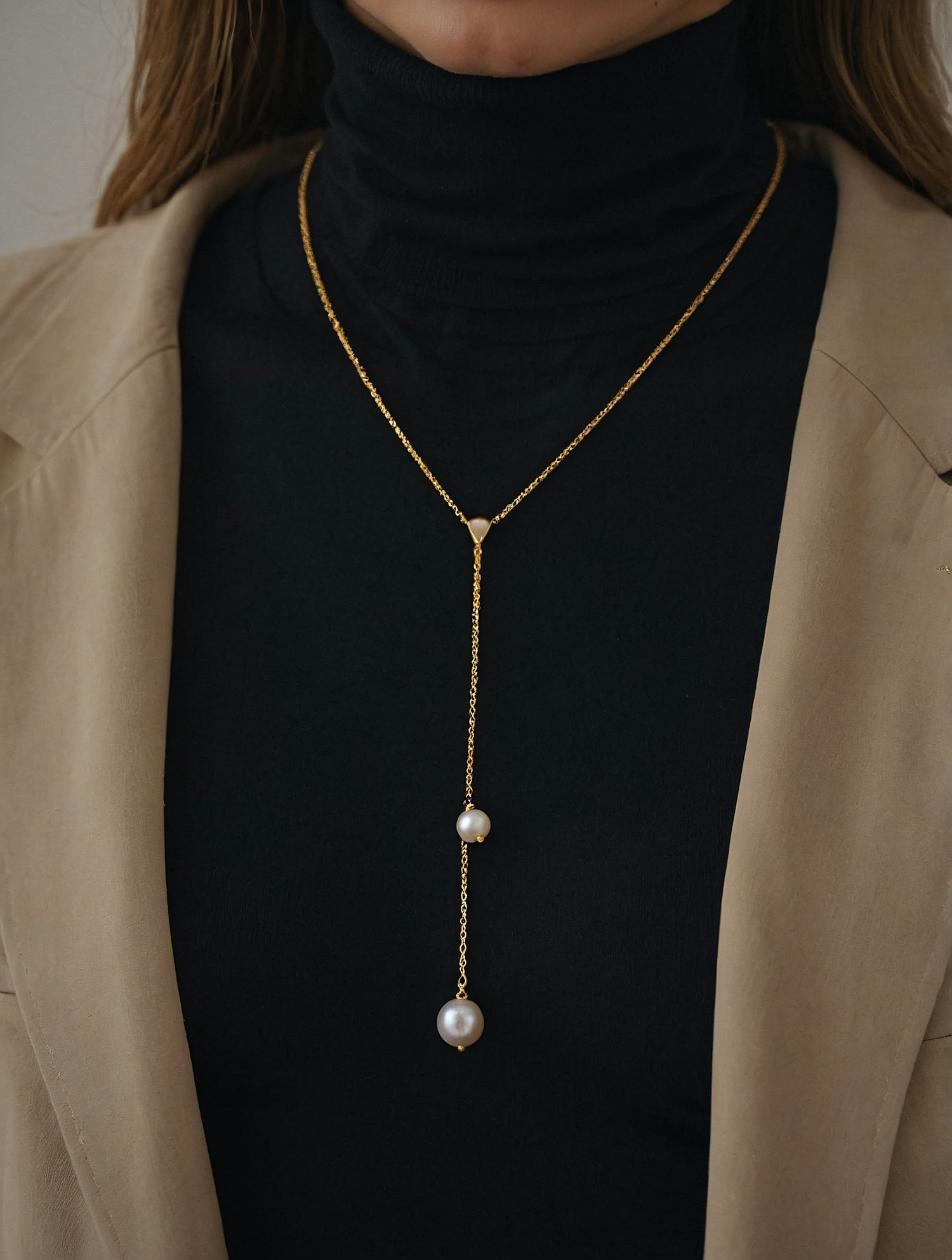 Elegant gold Y-shaped necklace with two pearls, styled over a black turtleneck and beige blazer for a chic, minimalist look.