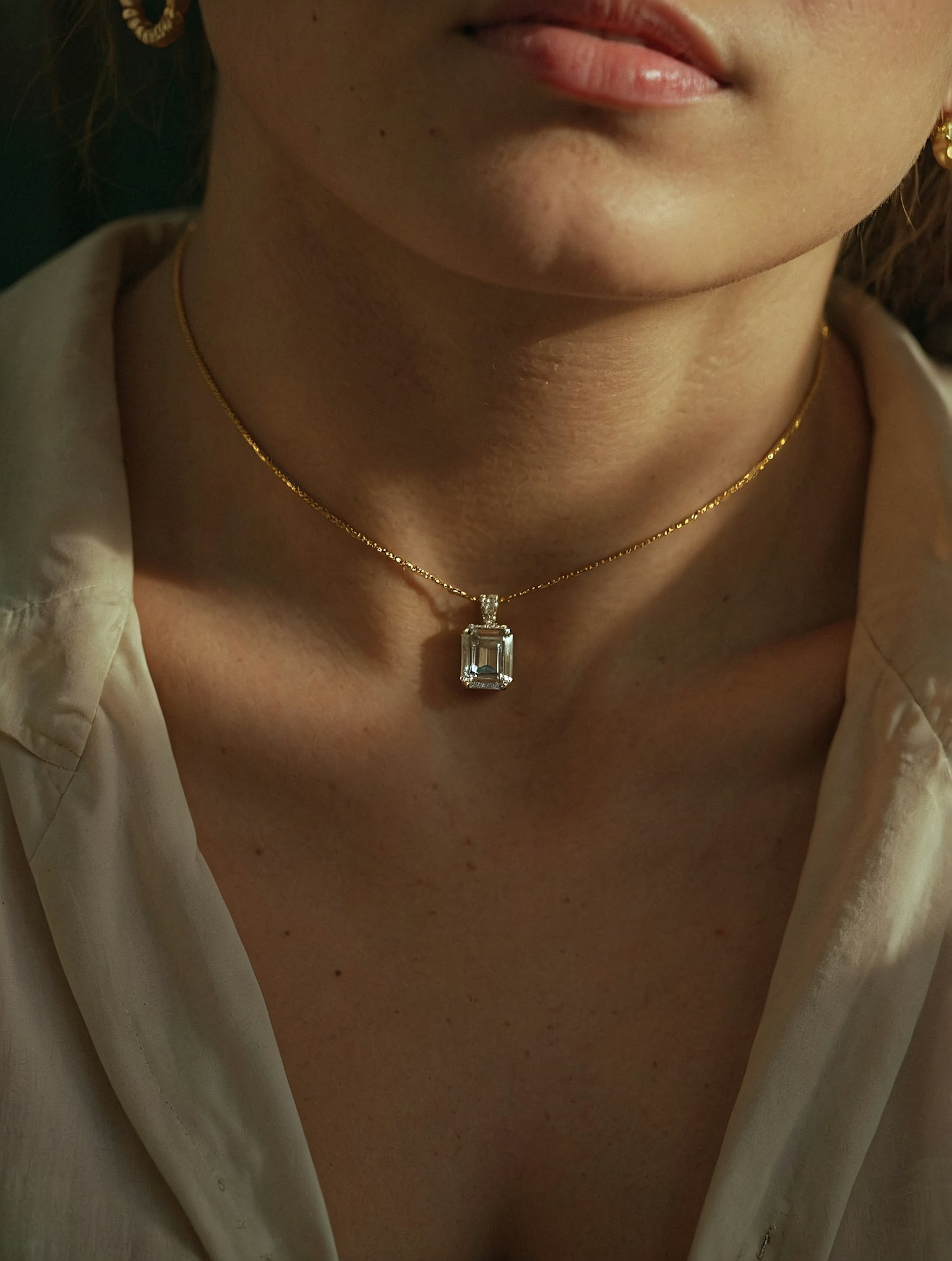 Close-up of a gold necklace with a rectangular gemstone pendant on a woman's neck, paired with a cream blouse and gold hoop earring.