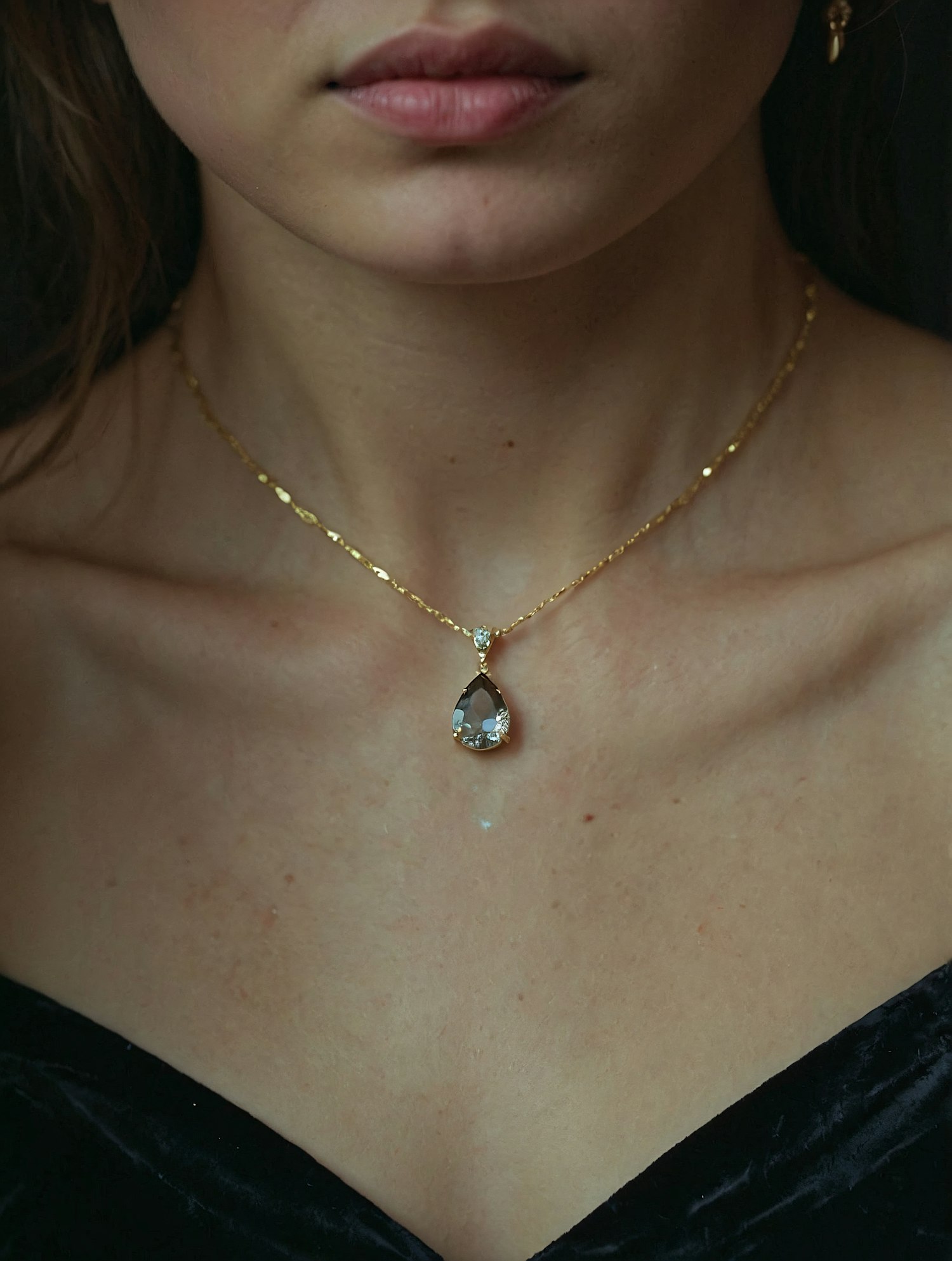 Elegant close-up of a gold necklace with a teardrop gemstone pendant, worn with a black velvet top. Perfect for jewelry inspiration.