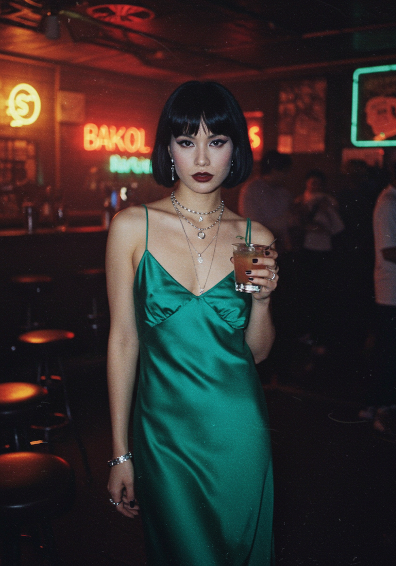 Stylish woman in a green satin dress holding a cocktail in a dimly lit bar with neon signs in the background.