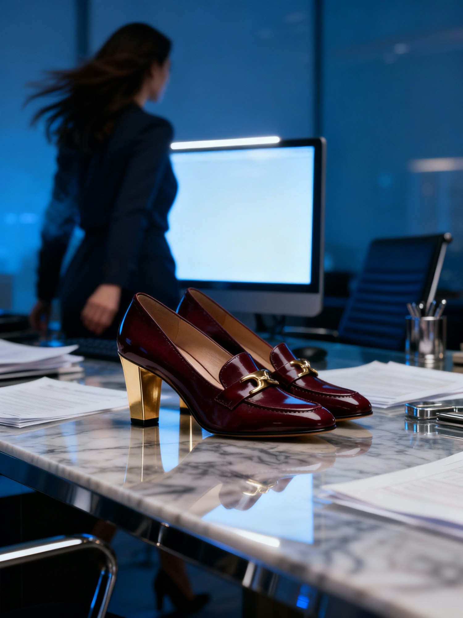 Elegant burgundy leather shoes with gold accents on a marble desk in a modern office, with a professional woman in the background.