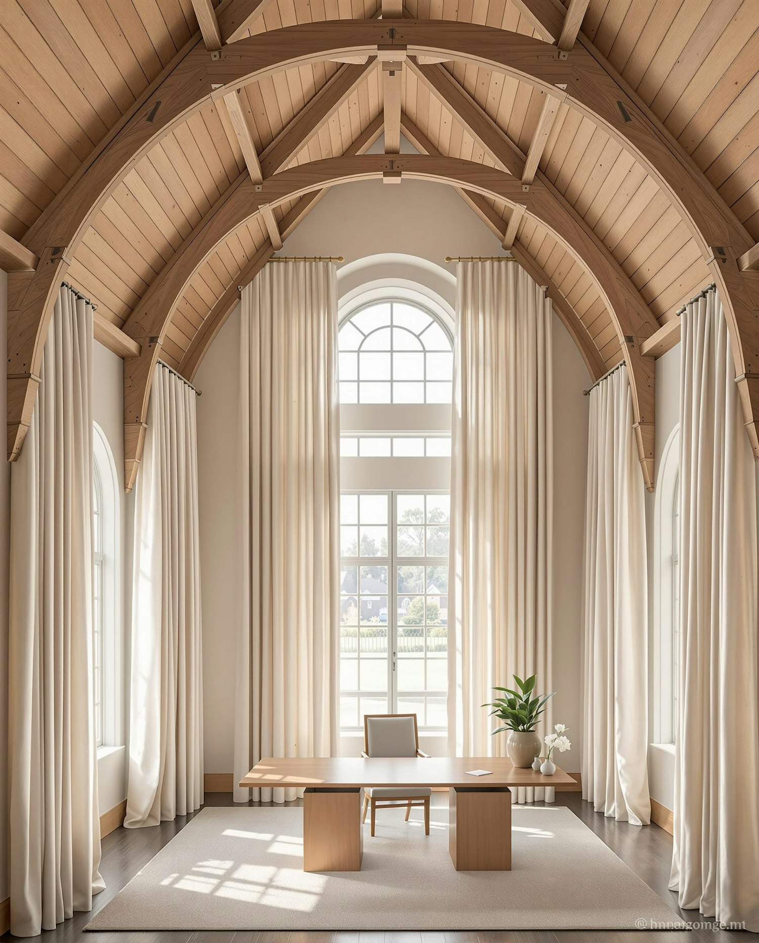 Bright office with vaulted wood ceiling, arched window, white curtains, minimalist wooden desk, and cozy beige rug.