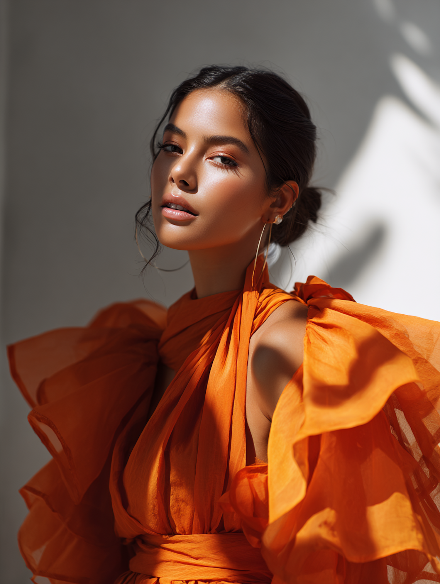 A woman in a vibrant orange dress with ruffled details poses gracefully, her features highlighted by soft lighting.