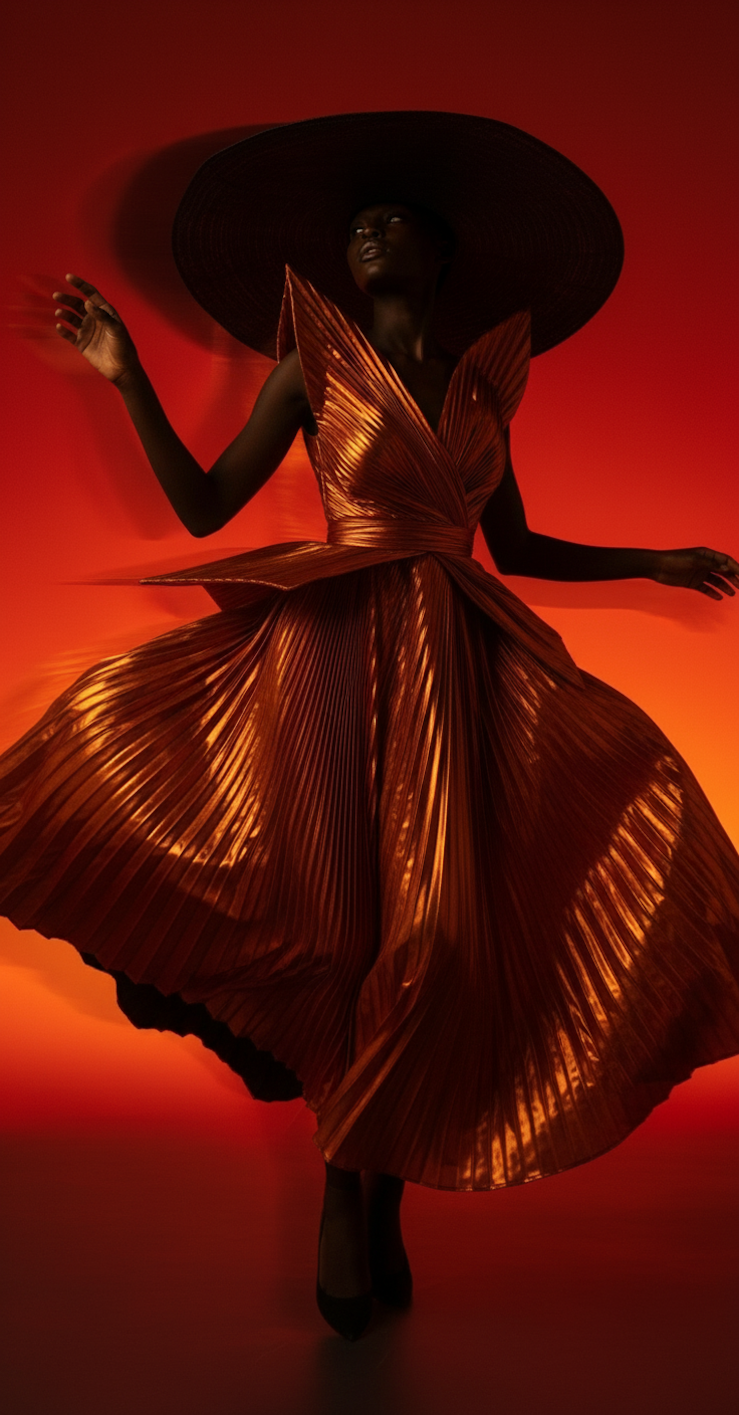 A person in a pleated metallic orange dress and wide-brimmed hat poses against a warm orange background, exuding elegance and style.