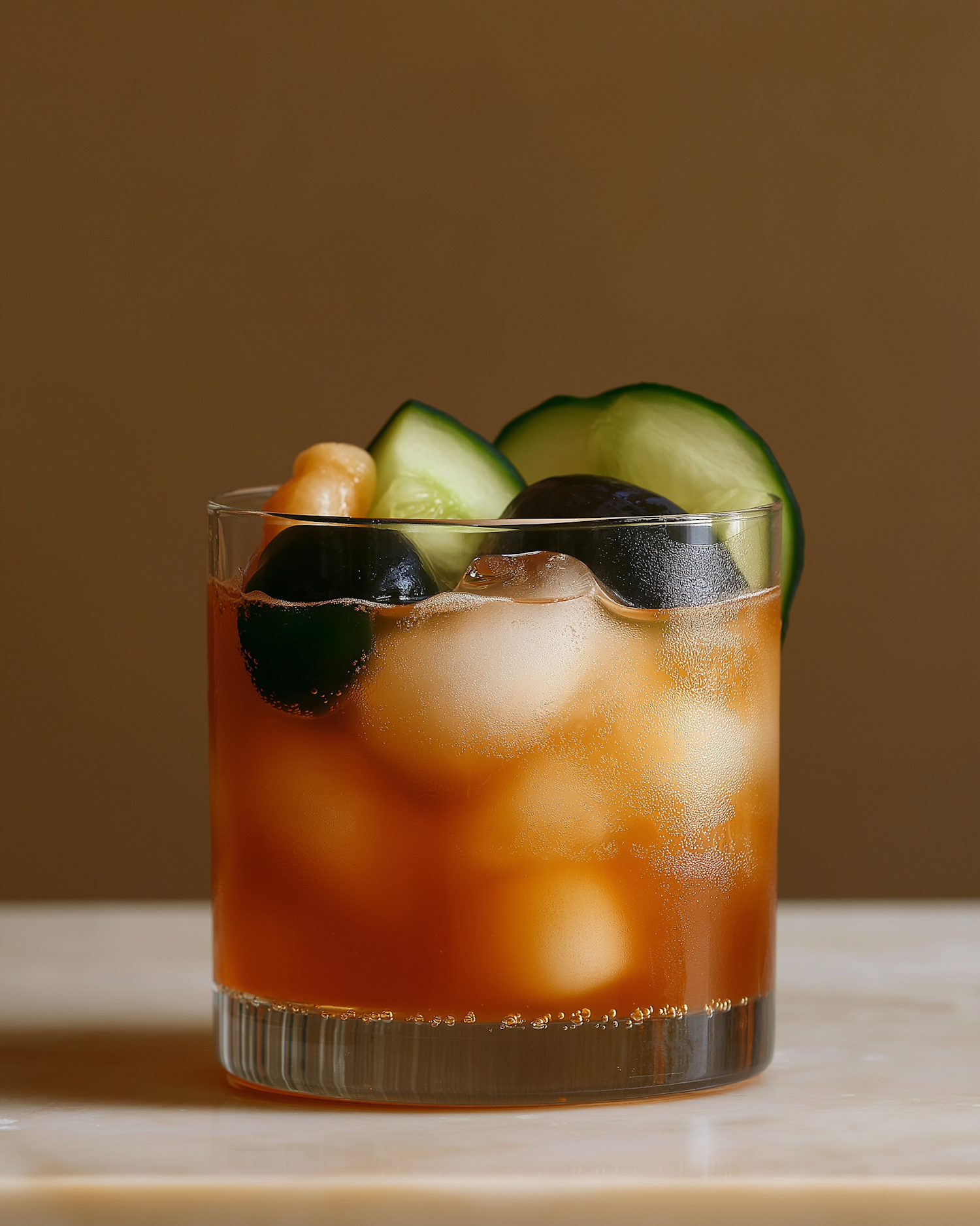 Elegant amber drink with ice, cucumber slices, and olives in a glass on a light surface, set against a warm background.