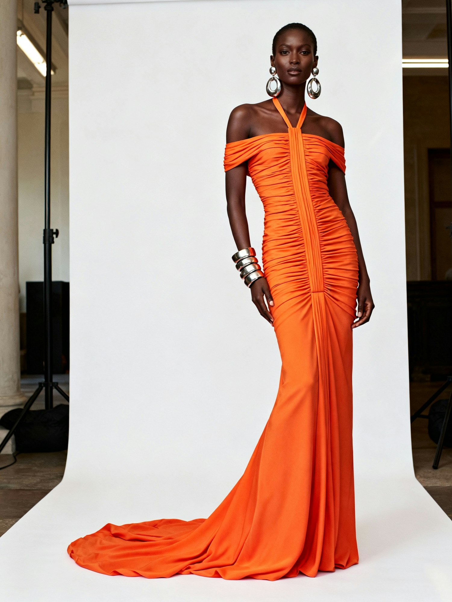 A high-fashion editorial photograph of a Black woman standing against a plain white studio backdrop. She wears a striking, floor-length orange gown with an off-the-shoulder neckline and a halter-style strap that connects at the neck. The gown features a ruched texture throughout, with a central vertical panel running symmetrically from the neckline to the hem, creating a structured and sculptural silhouette. She accessorizes with large statement earrings and multiple bold bracelets on one wrist, adding metallic contrast and visual rhythm. The lighting is soft and neutral, highlighting the gown’s texture and the contours of her figure. The mood is confident, radiant, and refined—celebrating bold color, intricate detailing, and empowered femininity in a minimalist setting.