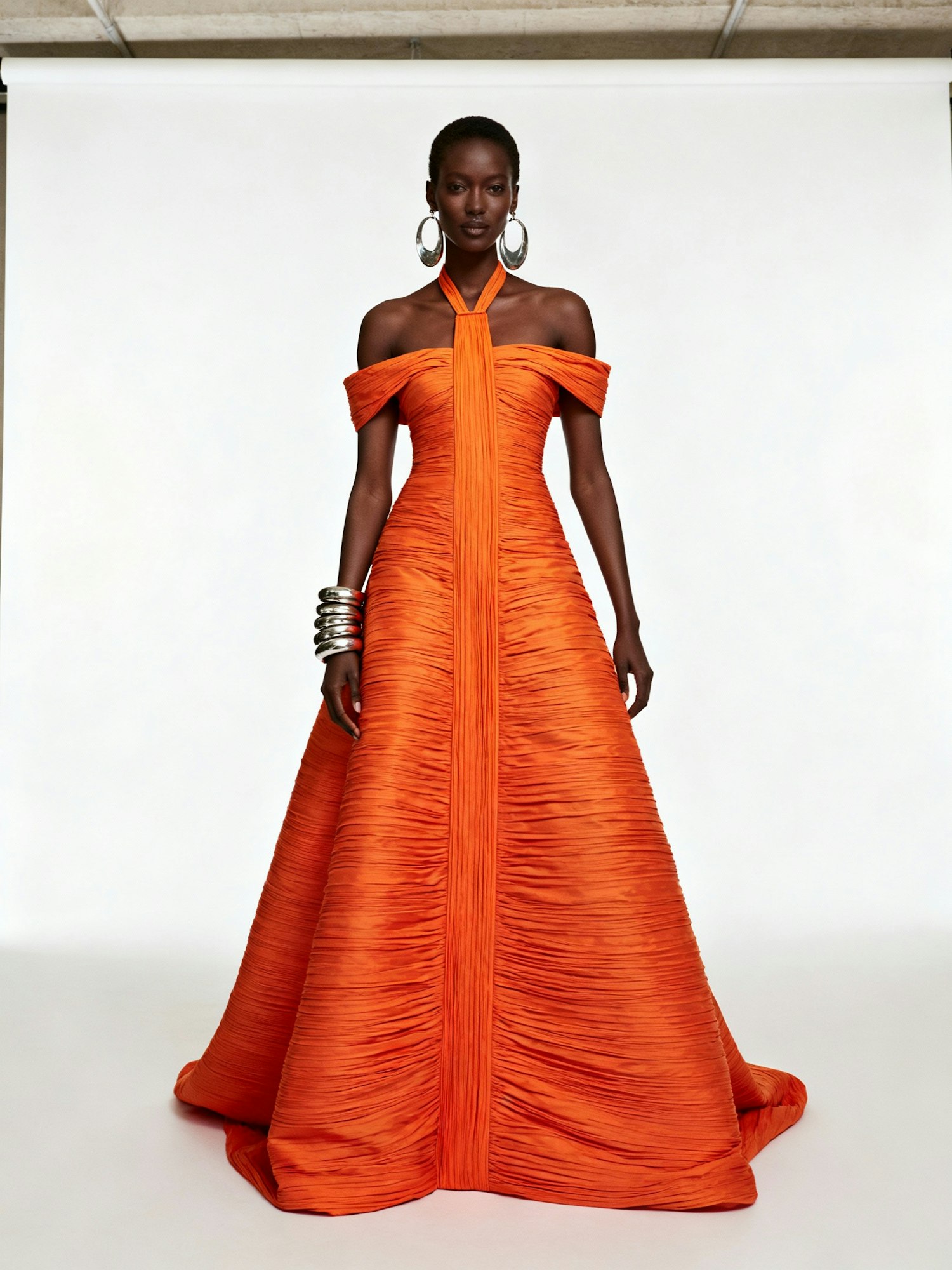 A high-fashion editorial photograph of a Black woman standing against a plain white studio backdrop. She wears a striking, floor-length orange gown with an off-the-shoulder neckline and a halter-style strap that connects at the neck. The gown features a ruched texture throughout, with a central vertical panel running symmetrically from the neckline to the hem, creating a structured and sculptural silhouette. She accessorizes with large statement earrings and multiple bold bracelets on one wrist, adding metallic contrast and visual rhythm. The lighting is soft and neutral, highlighting the gown’s texture and the contours of her figure. The mood is confident, radiant, and refined—celebrating bold color, intricate detailing, and empowered femininity in a minimalist setting.
