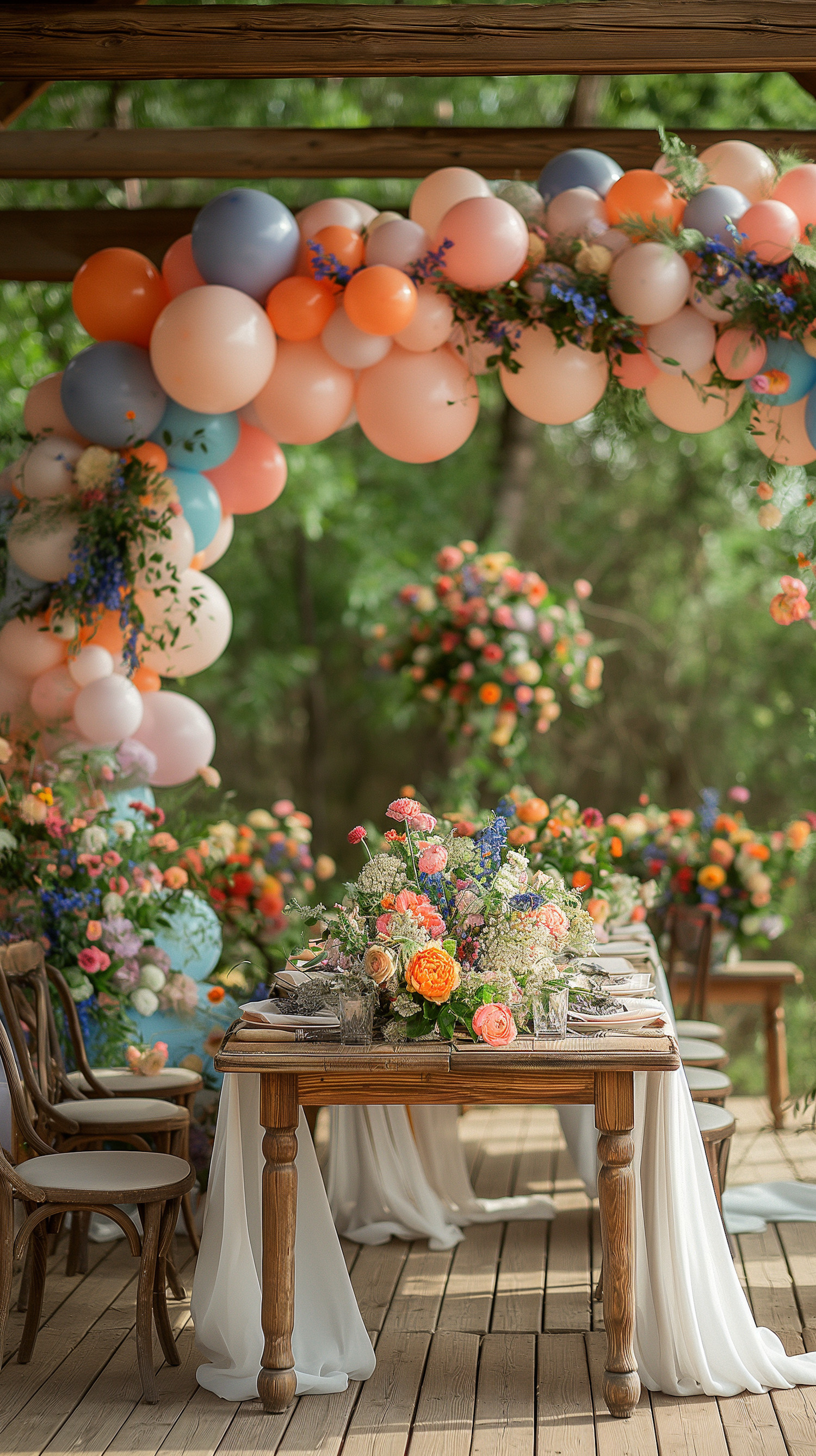 Elegant outdoor table setting with colorful balloons and vibrant floral arrangements, perfect for a festive celebration.
