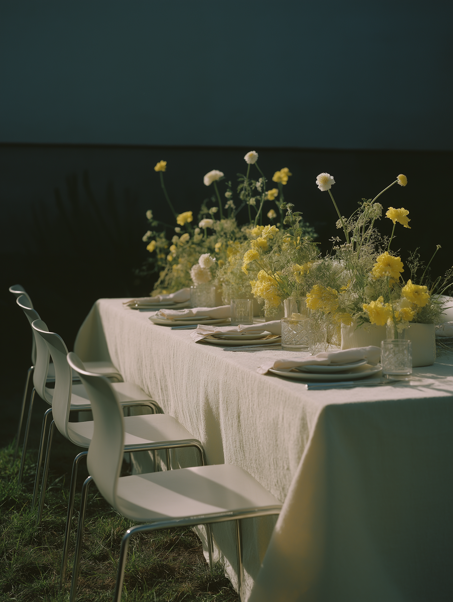 Elegant outdoor table with white chairs, bright yellow flowers, and crystal glassware, perfect for a stylish celebratory meal.