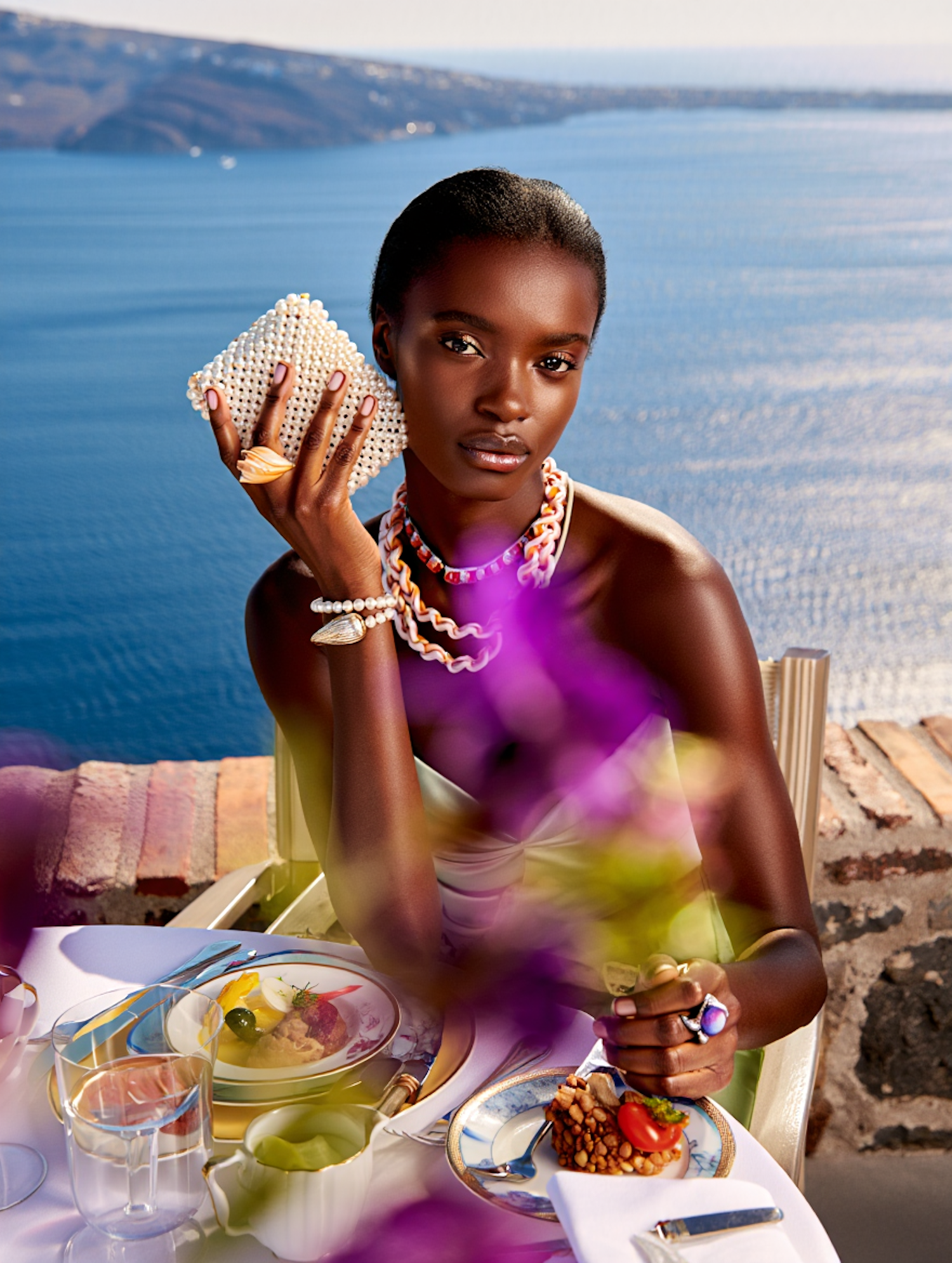 A woman dining outdoors by the ocean, elegantly dressed, with a scenic backdrop and vibrant flowers enhancing the luxurious ambiance.