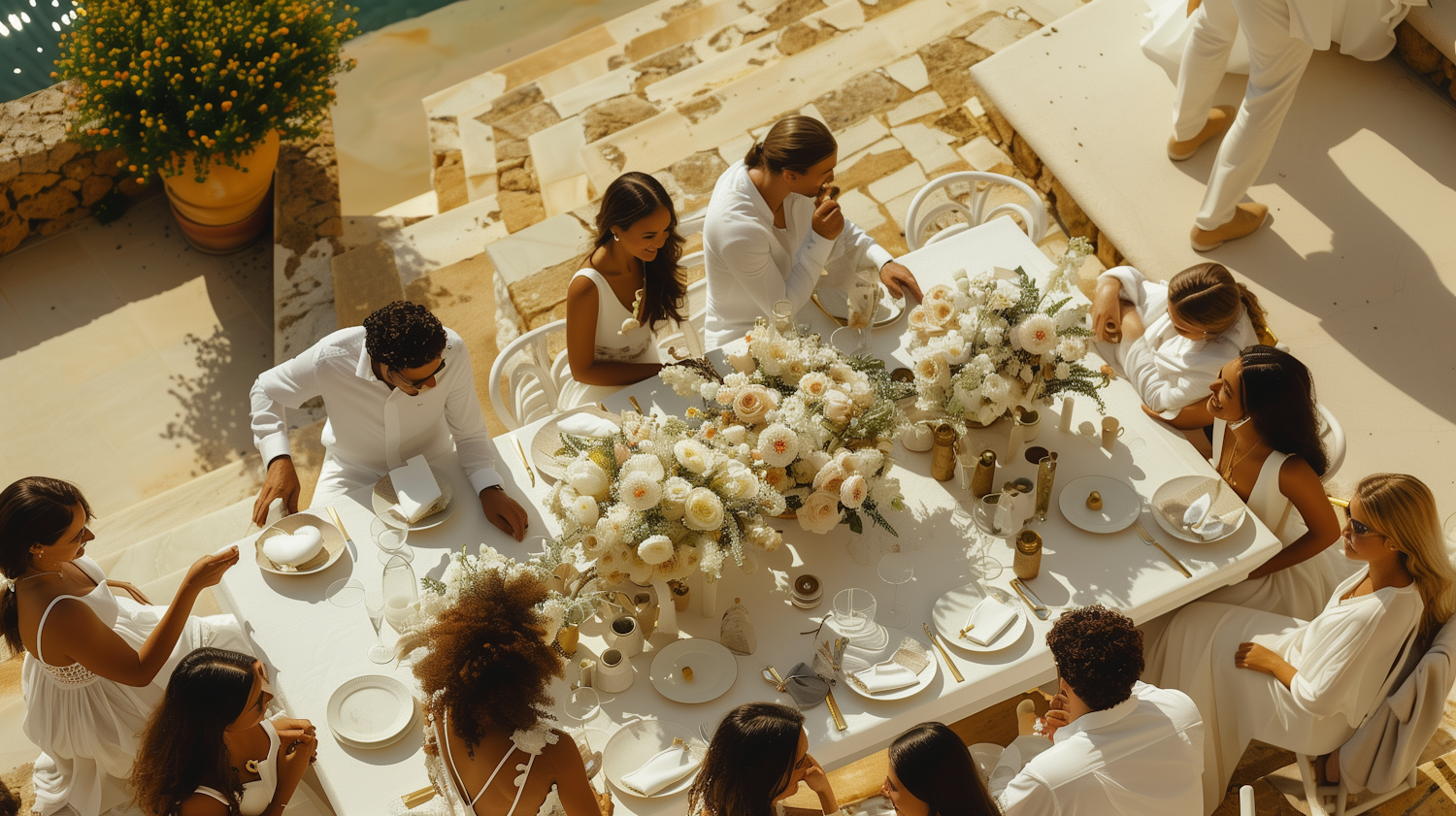 Elegant outdoor dining scene with people in white attire, surrounded by lush floral arrangements and warm sunlight.