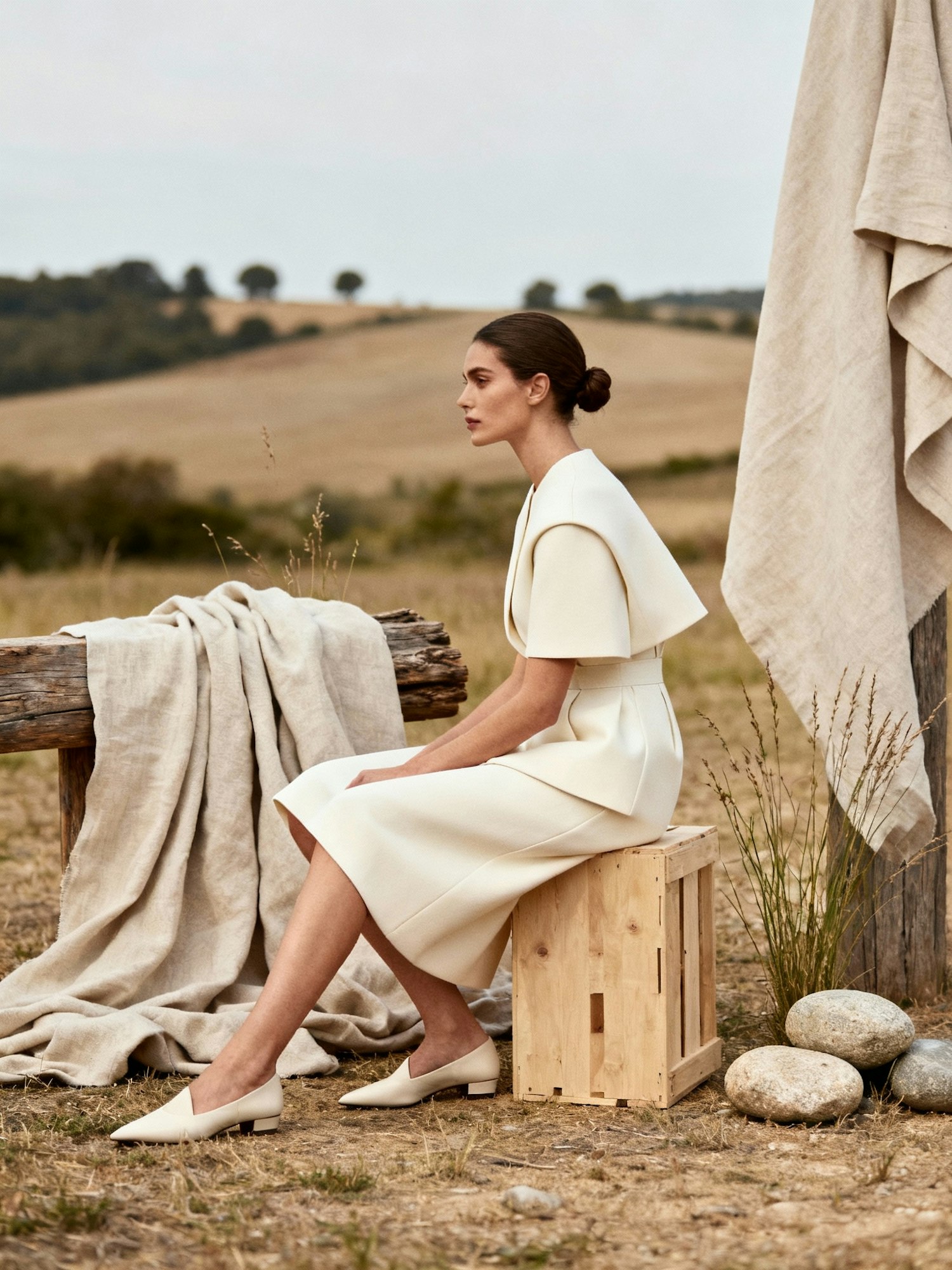 A woman in a white dress sits on a wooden crate in a serene outdoor setting, surrounded by natural elements and a backdrop of rolling hills.