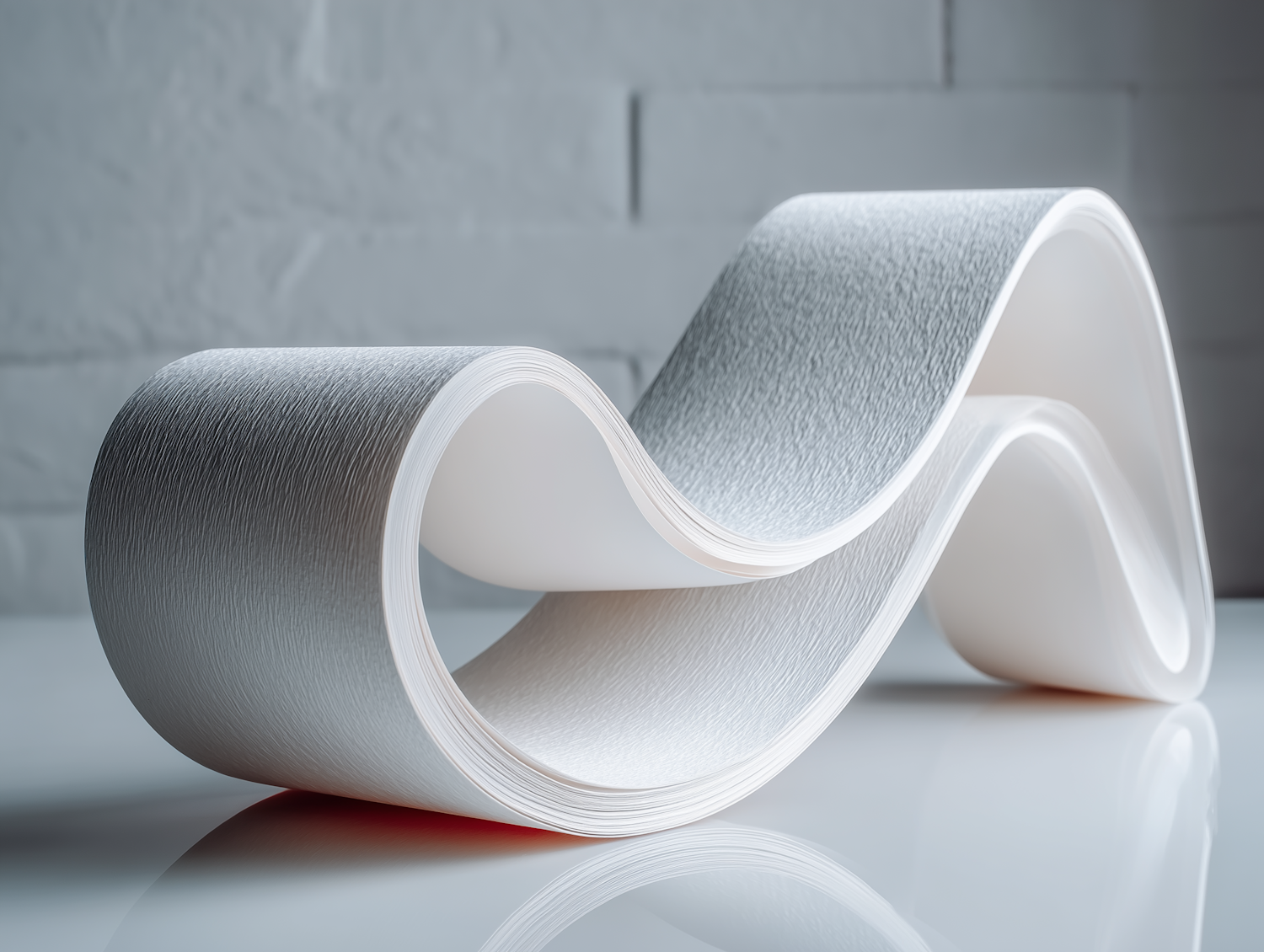 A folded, textured white material in a wave-like shape on a reflective surface, with soft lighting and a minimalistic background.