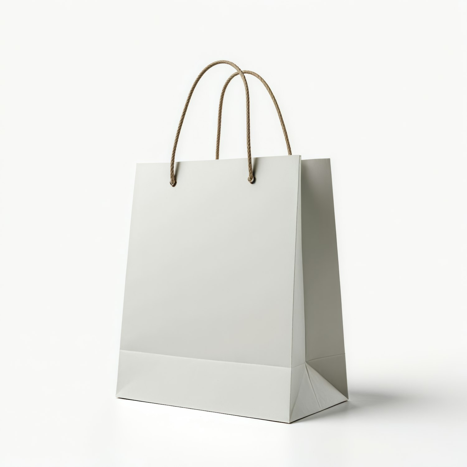 Minimalist white paper shopping bag with brown rope handles on a white background, perfect for retail and branding.