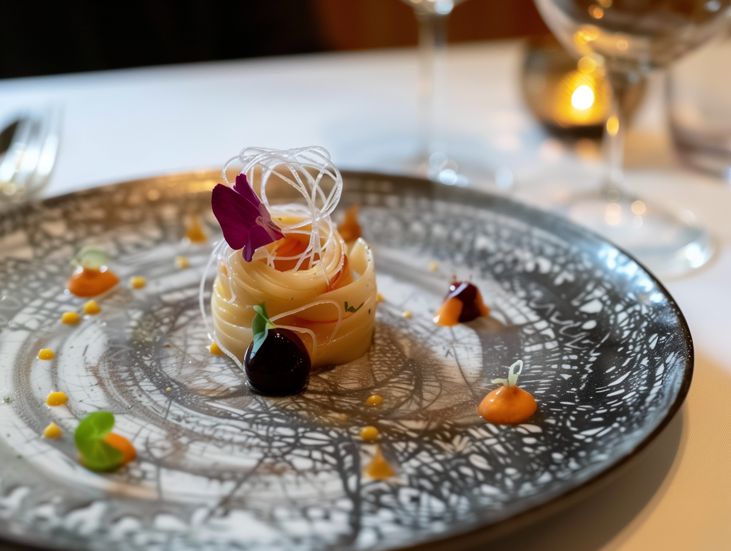Elegant pasta dish with artistic plating, featuring vibrant sauces and a decorative flower on a patterned plate.