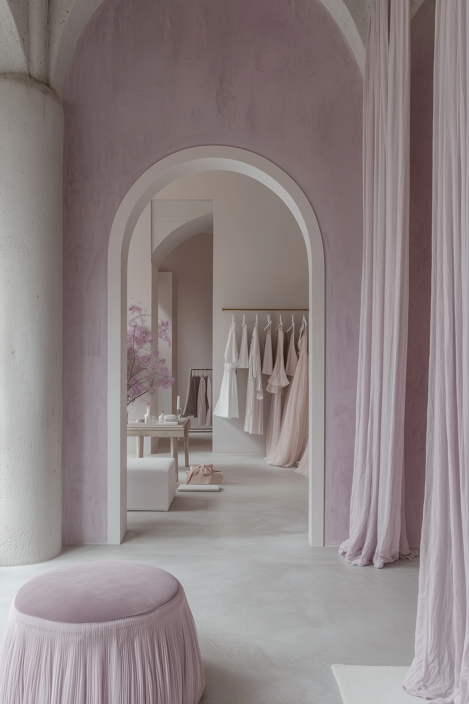 Elegant pastel-toned interior with flowing drapes, a lavender ottoman, and a clothing rack of delicate dresses. Calm and sophisticated vibe.