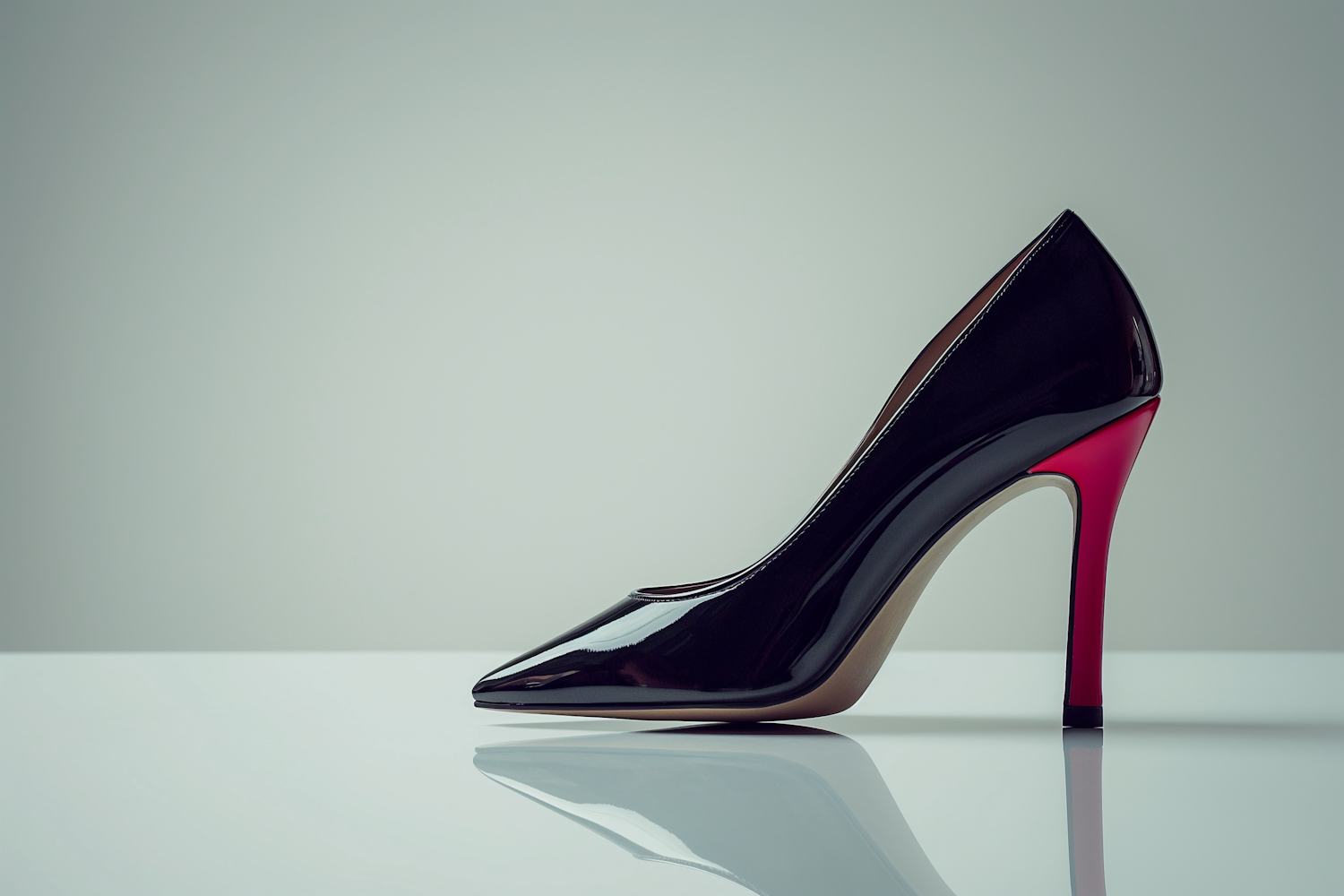 Elegant black high heel with a striking red sole on a reflective surface, showcasing sleek design and bold color contrast.