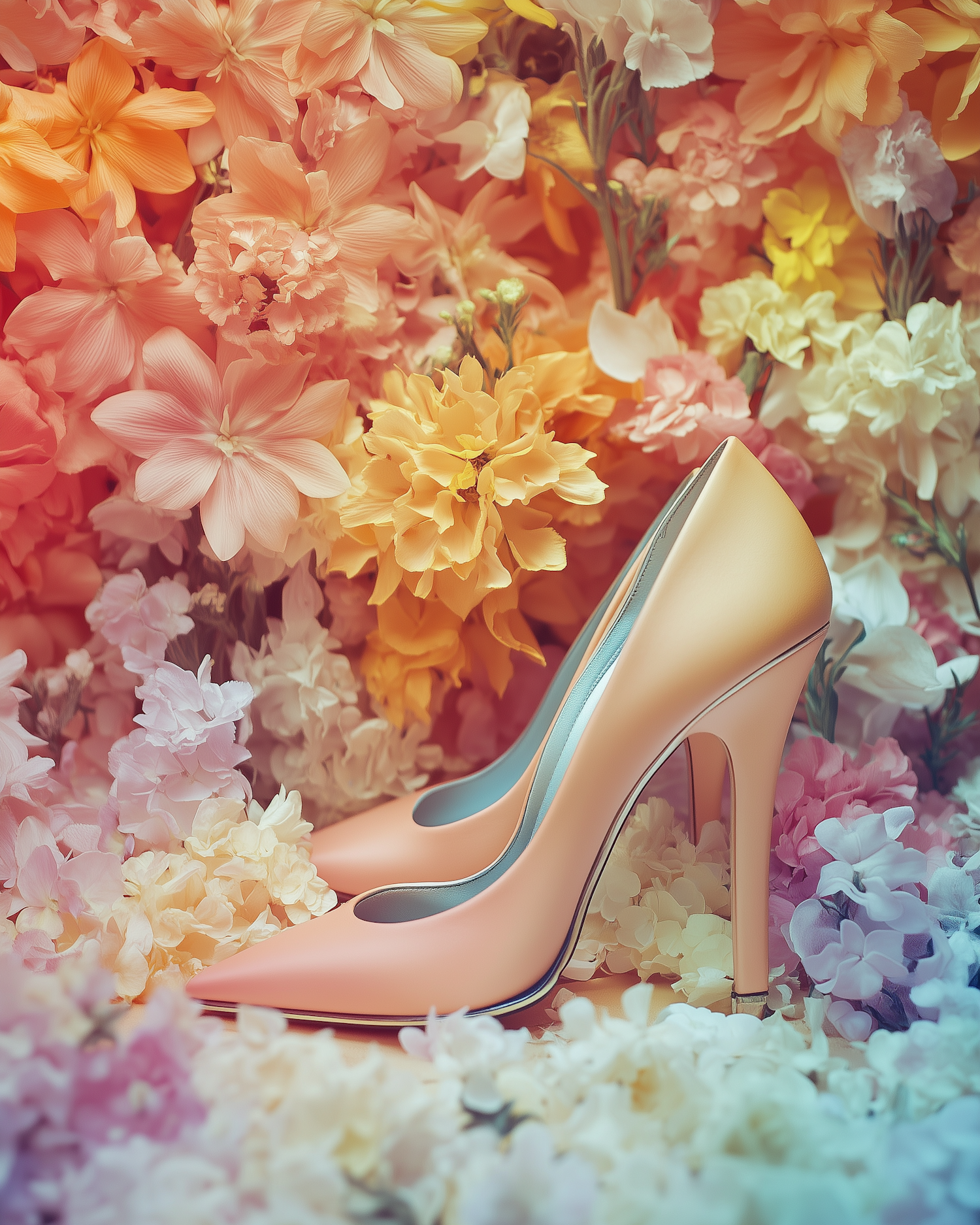 Elegant peach high heels surrounded by vibrant flowers in orange, yellow, and pink hues, creating a luxurious and feminine scene.