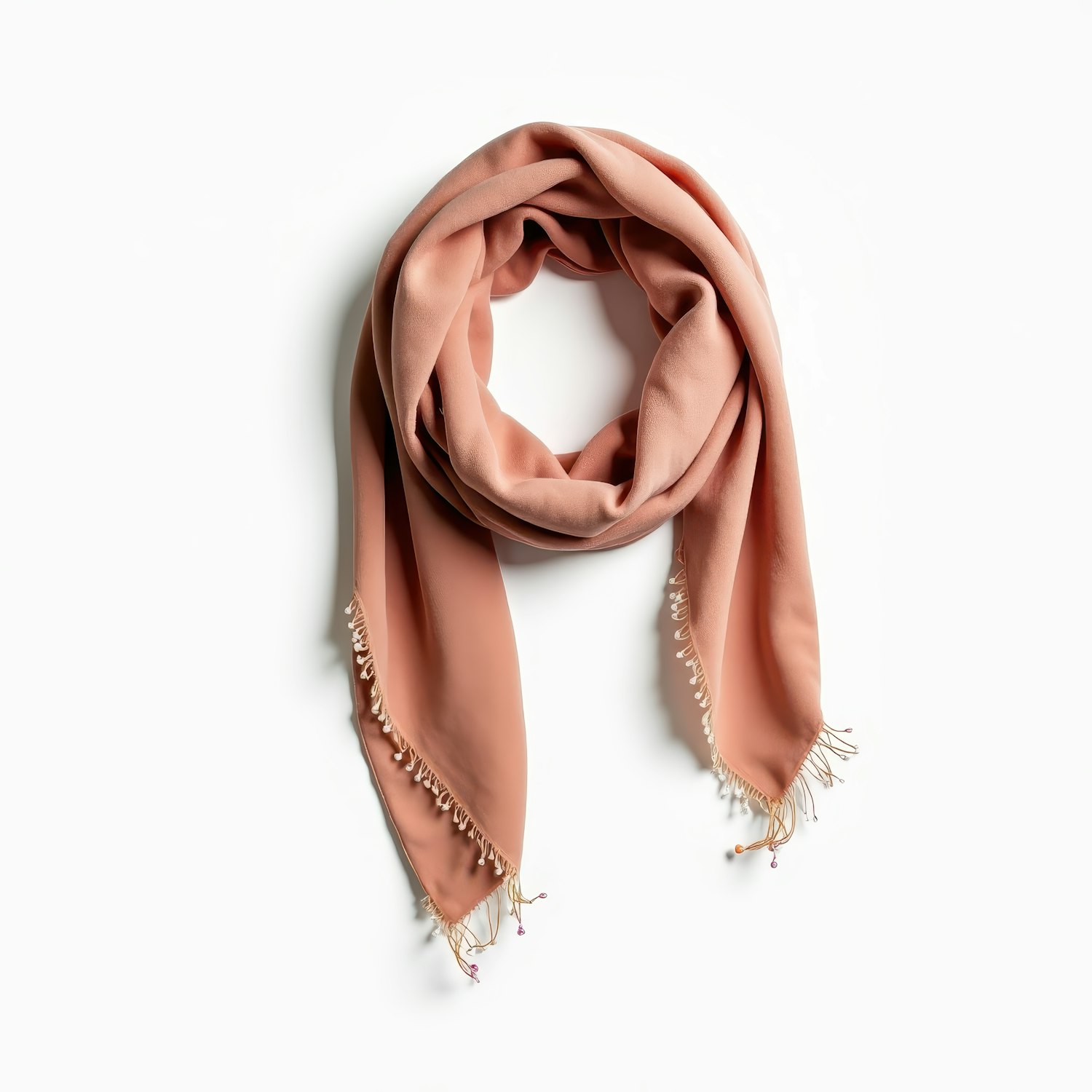 Elegant peach scarf with delicate fringes and bead embellishments, arranged in a circular shape on a white background.