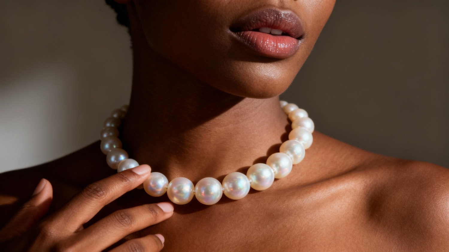 Close-up of a pearl necklace worn by a person with warm-toned skin, highlighting the lustrous pearls and elegant composition.
