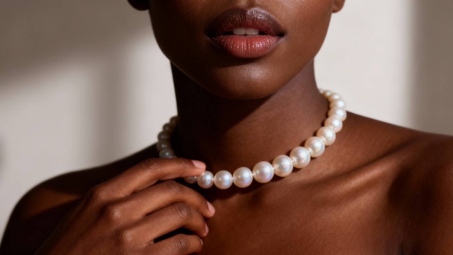 Close-up of a person with dark skin wearing a pearl necklace, highlighting the jewelry's elegance and the subject's natural beauty.