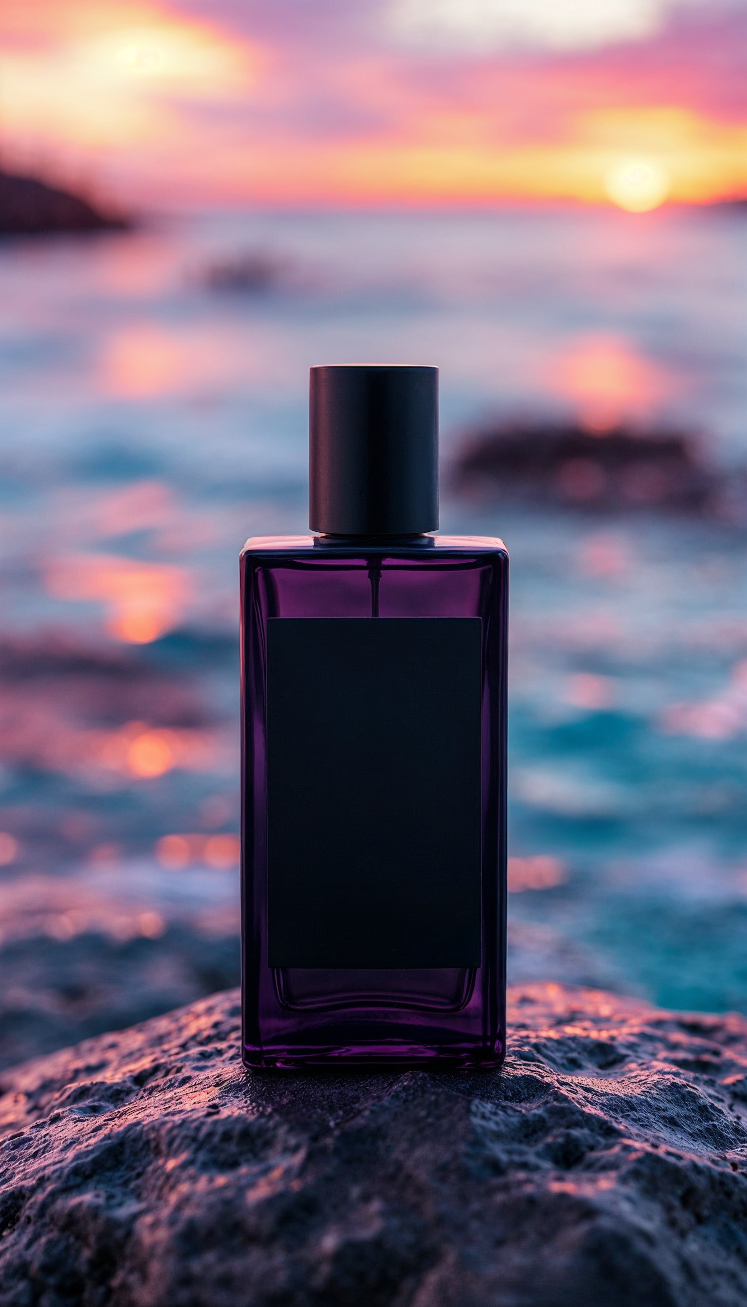 Elegant dark purple perfume bottle on a rock with a stunning sunset over the ocean in the background.