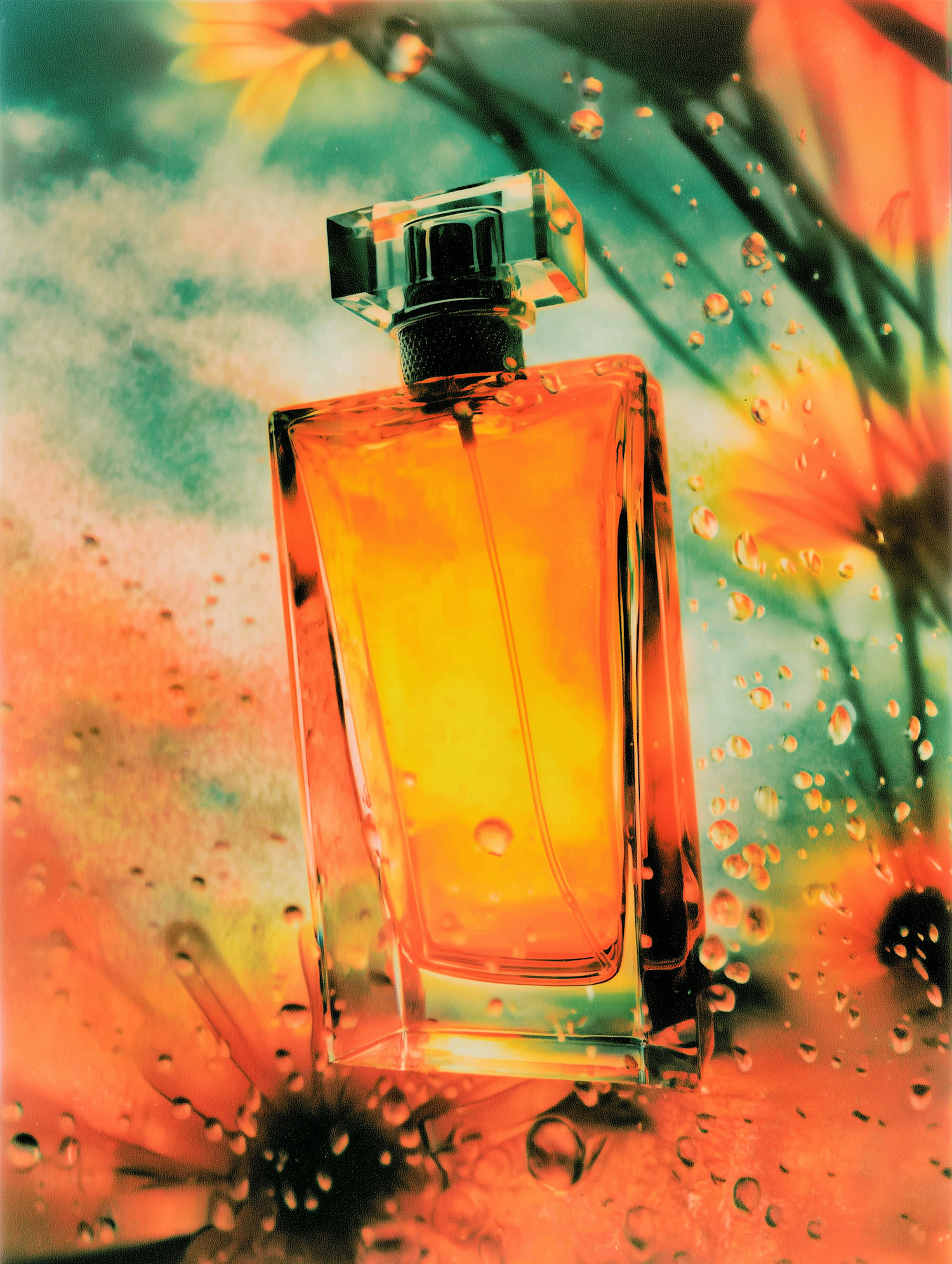 A vibrant perfume bottle with amber liquid, set against a colorful floral background with water droplets for a refreshing touch.