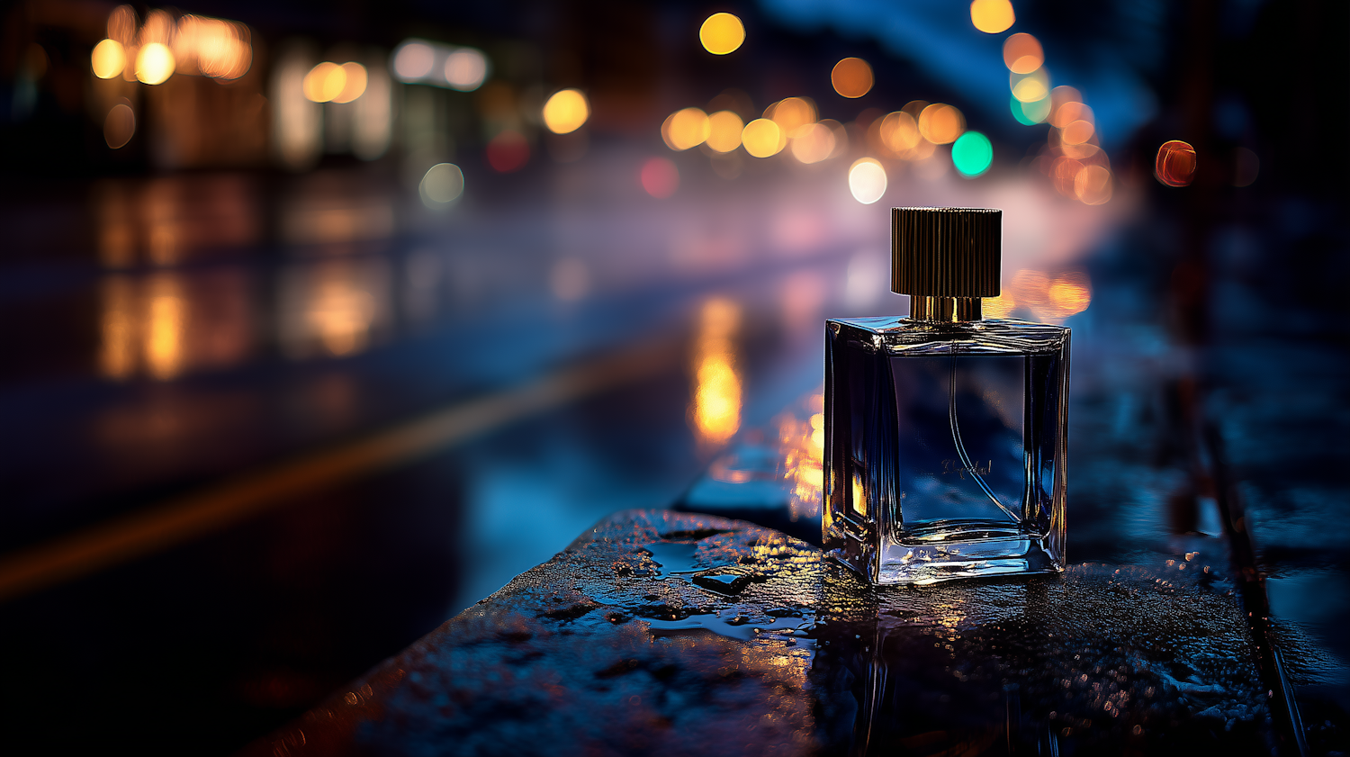 Elegant glass perfume bottle with golden cap on a wet surface, set against a dreamy urban nightscape with vibrant bokeh lights.
