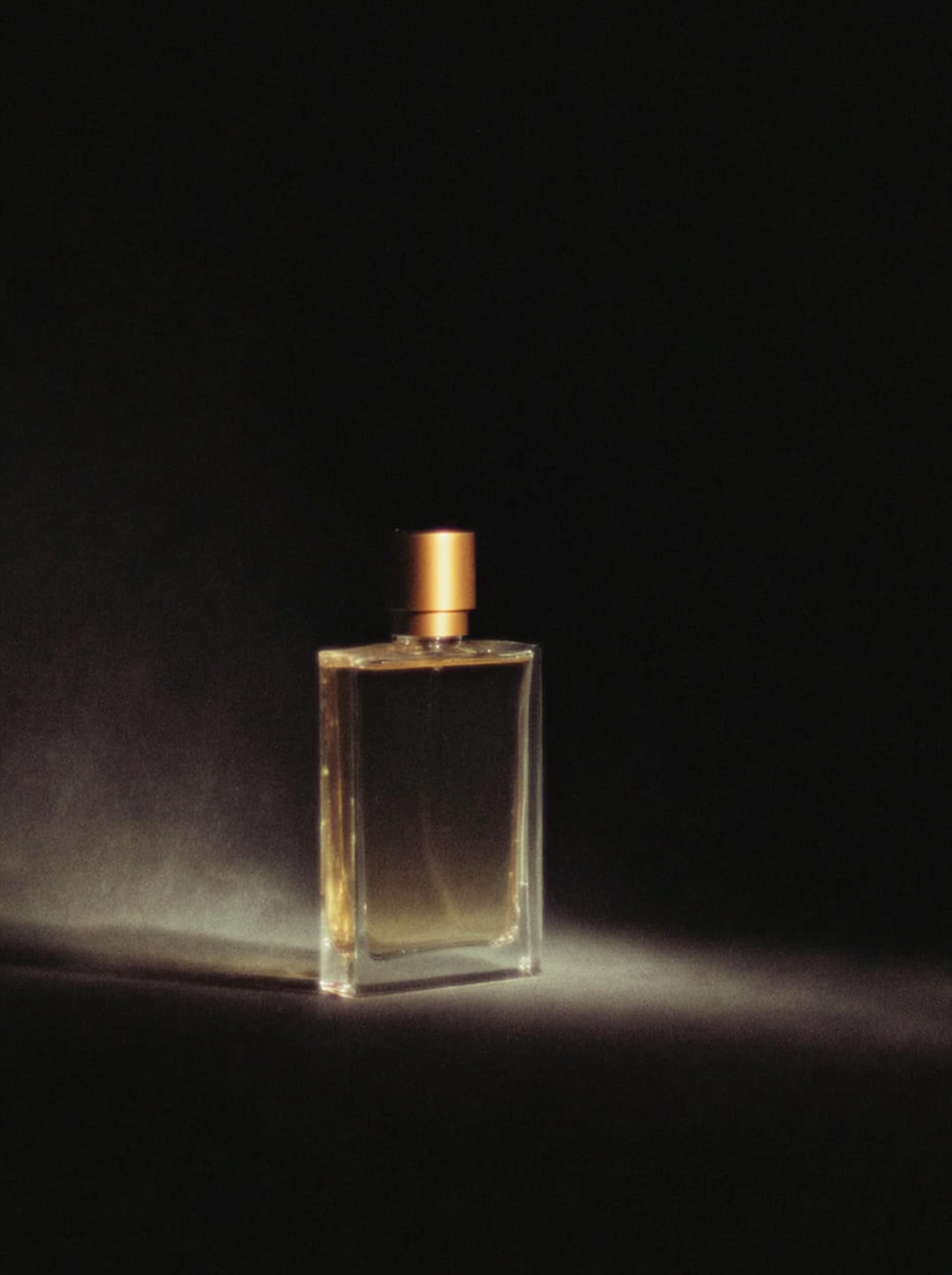A sleek glass perfume bottle with a golden cap, illuminated dramatically against a dark background, exuding elegance and simplicity.