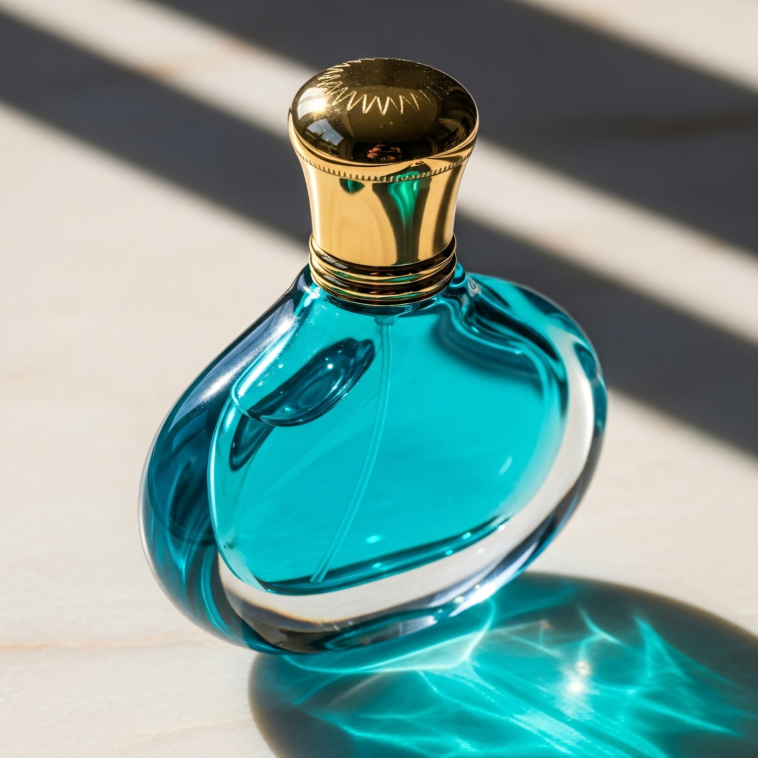 Elegant blue perfume bottle with a gold cap, reflecting sunlight on a light surface, showcasing its luxurious design.