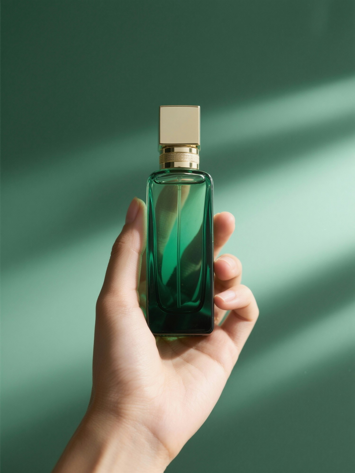 A hand holding a green glass perfume bottle with a golden cap, set against a green background with soft lighting and shadows.