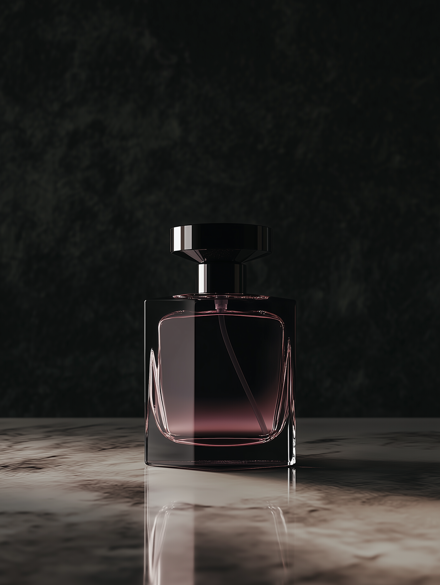 Minimalist perfume bottle with dark liquid on a marble surface, set against a textured dark background for a luxurious vibe.