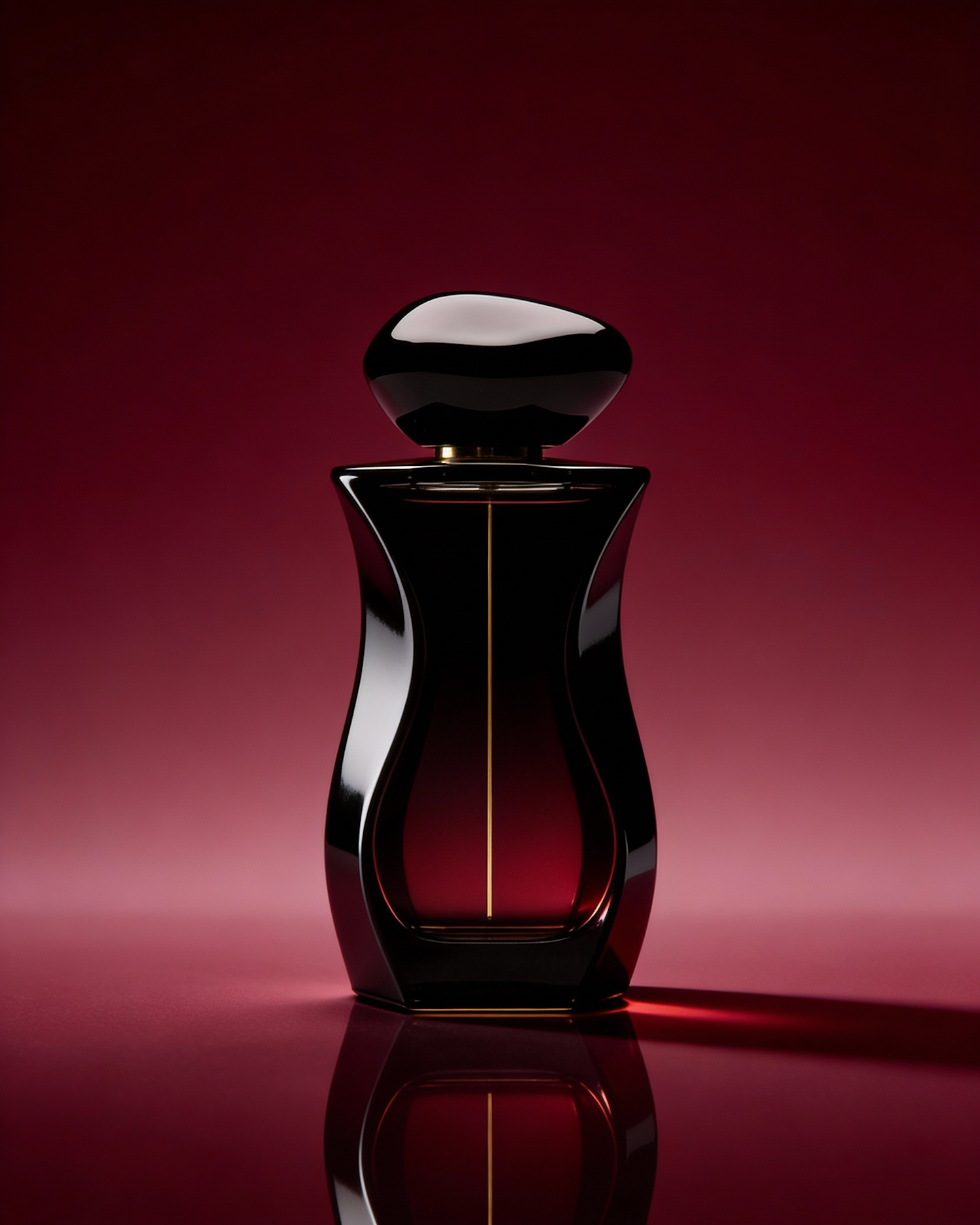 A luxurious black perfume bottle with a golden accent, set against a gradient red background, showcasing elegance and sophistication.
