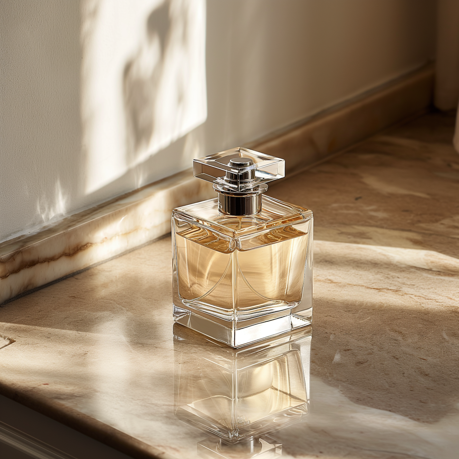 Elegant glass perfume bottle on marble, bathed in warm sunlight, with amber liquid and sleek design. Luxurious and serene atmosphere.