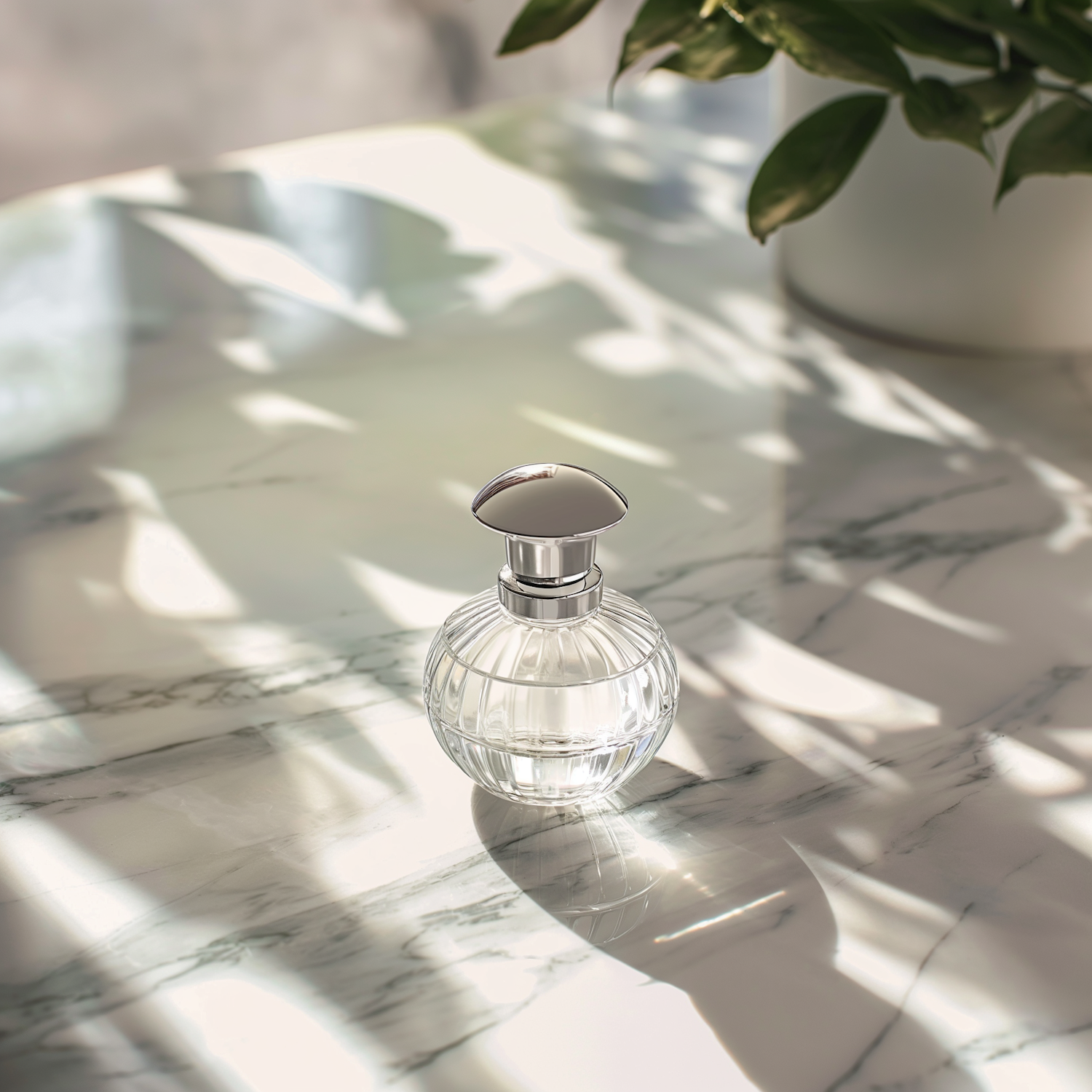 Elegant perfume bottle on a marble surface with sunlight and leaf shadows, creating a luxurious and tranquil atmosphere.